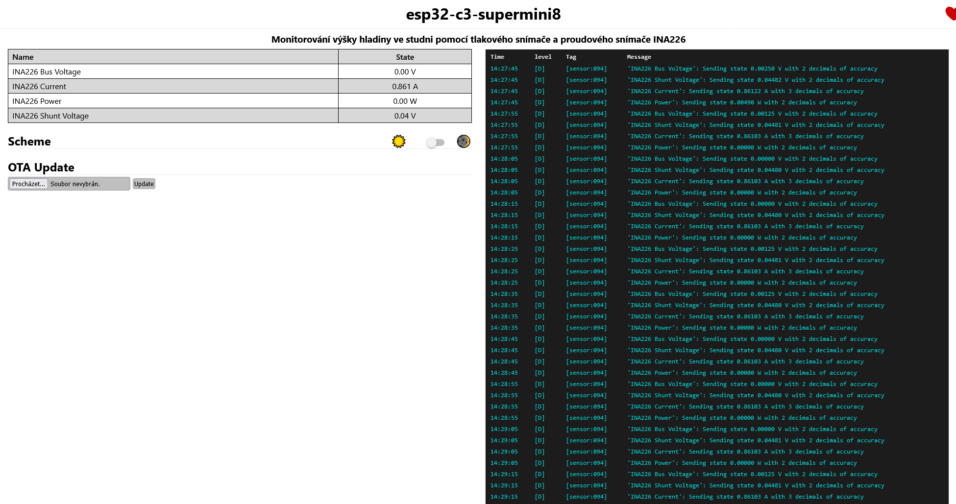 To je doporučené schéma od výrobce. Daný modul střídavě měří proud a napětí spotřebičem (proto ten interní přepínač) a posílá dál proud, napětí a výkon. Já ho využívám jen jako převodník proudu (ty dva napěťové piny nemám vůbec zapojené), ale někdo tím bude třeba měřit spotřebu. Když se modul naletuje na nějaké esp8266 nebo esp32, kam se pošle firmware espHome (z PC přes USB kabel), tak to ve webovském prohlížeči vypadá třeba takto: