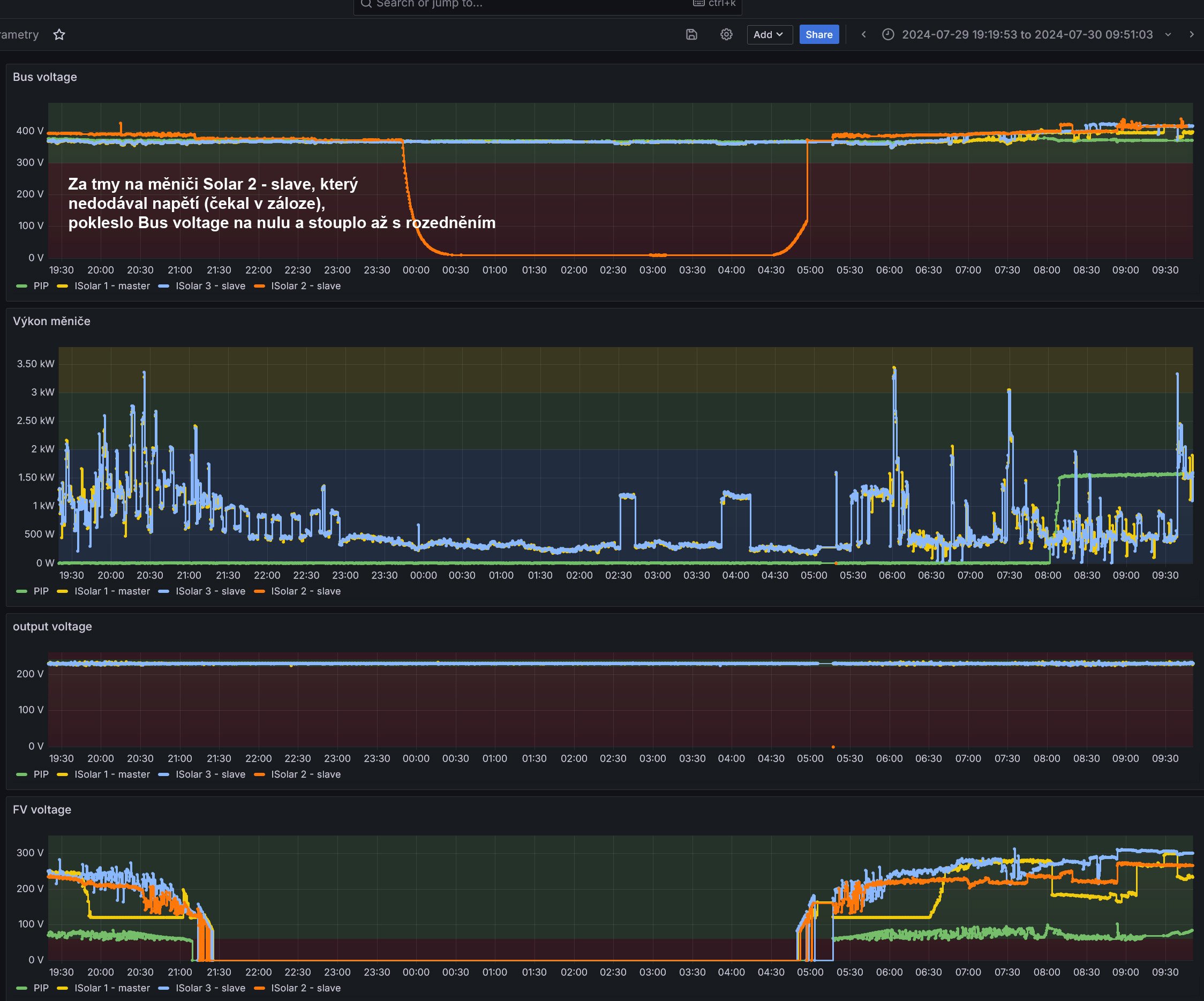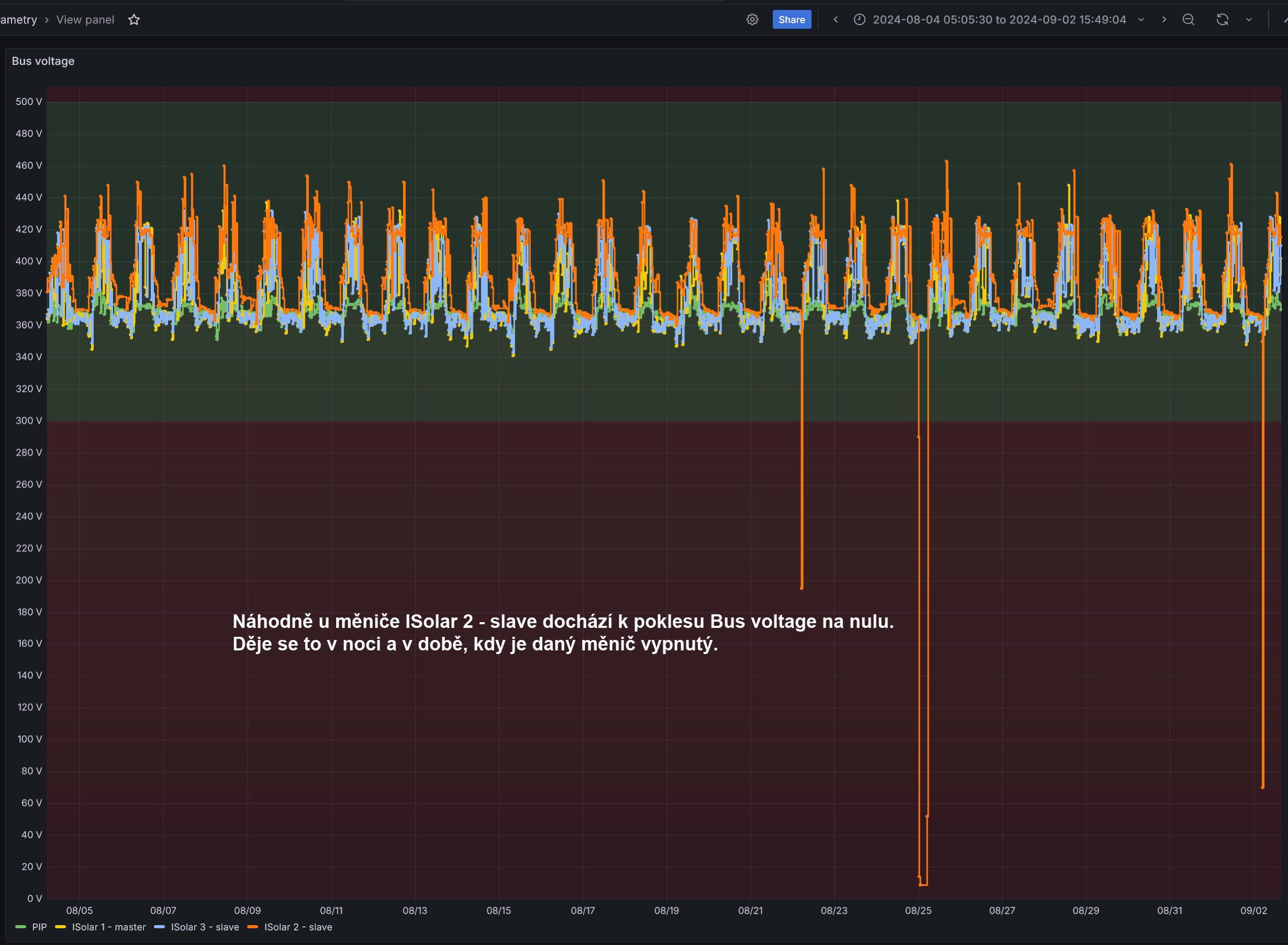 3 paralelní měniče ISolar II. U jednoho (ISolar 2 - slave) dochází náhodně (jednou za několik dnů) k poklesu Bus voltage na nulu. Je to v noci a v době, kdy je daný měnič vypnutý (zapne se až když nestačí výkon ostatních dvou měničů).