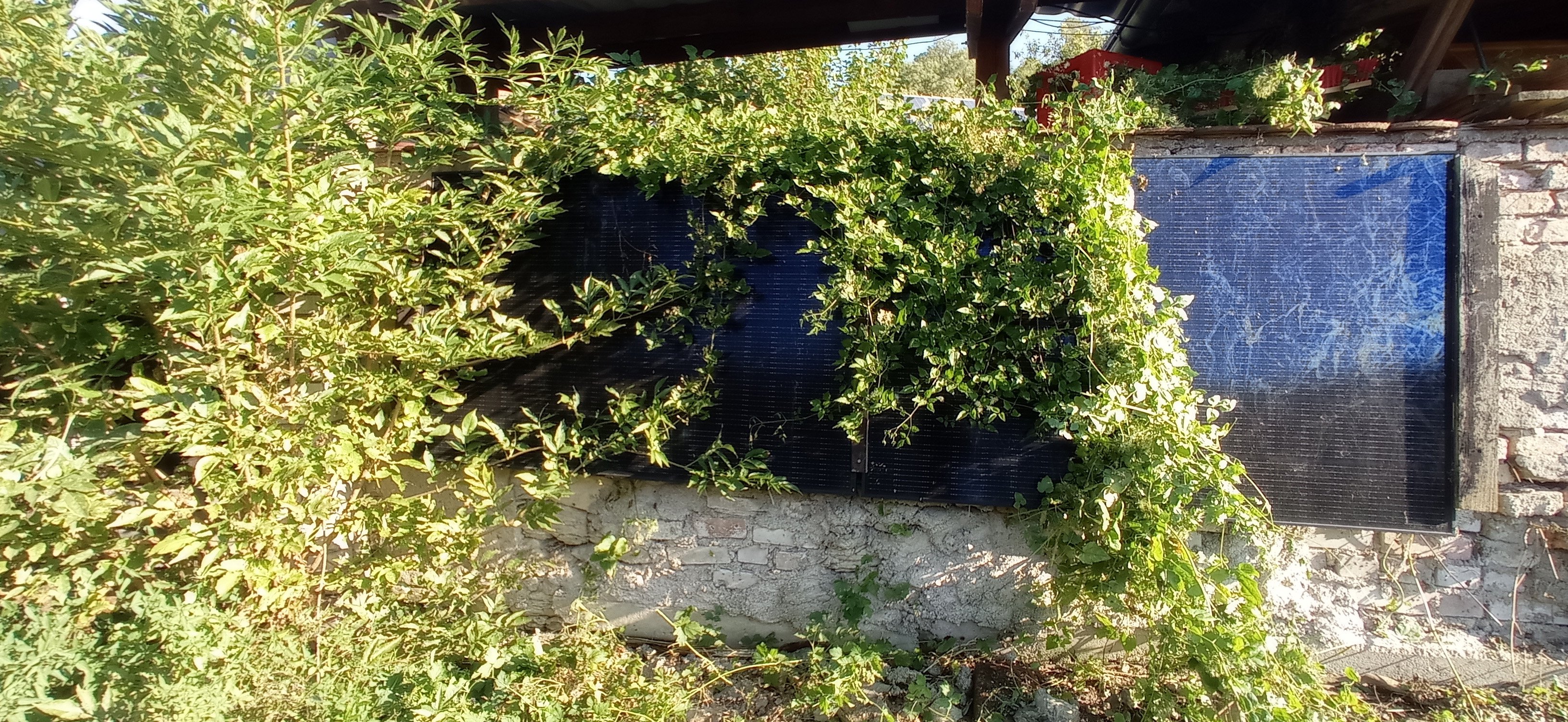 Solární plot byl přes sluneční sezónu odpojen a fungoval jen jako plot a jak je vidět pod částí, kde jsem roští strhl, i jako dálnice pro hlemýždě (ty krouceniny na skle jsou stopy jejich cestování). Za ten půlrok zarostl a tak ho bude potřeba na zimu vysekat z roští: