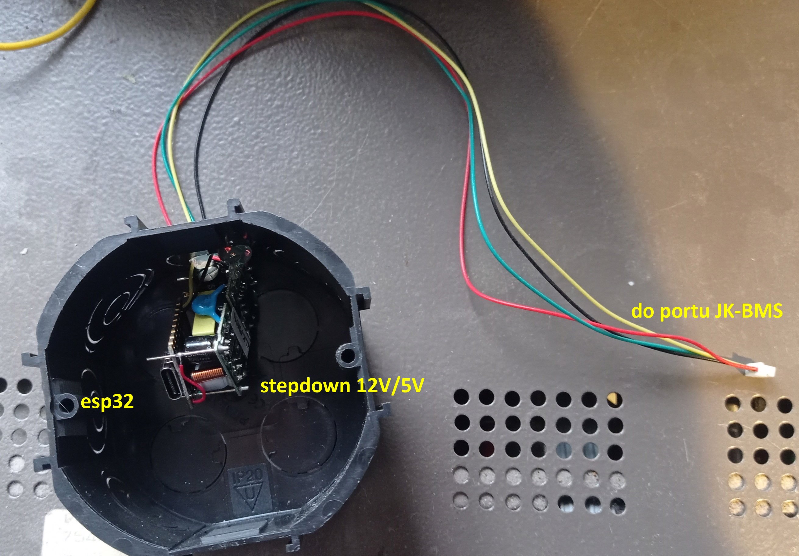 Do standardní instalatérské krabičky jsem tavnou pistolí vlepil esp32 + stepdown 12V/5V měnič aby se to dalo napájet rovnou z JK-BMS Ten kablík je z ali, protože i když jsem vybaven na krimlování těchto minikonektorů, je to otročina: Nahrál jsem tam známý soft pro ovládání JK-BMS v prostředí espHome (HA) https://github.com/syssi/esphome-jk-bms ... ample.yaml (kompiluje se to rovnou v HA).