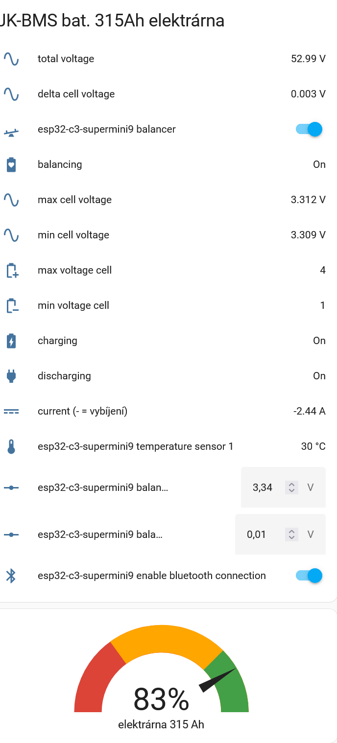 Následuje spuštění pomocí tlačítka, které už dodávají k JK-BMS dost často (takže nemusím startovat JK-BMS externím zdrojem). Ještě nemám připojené esp32, abych se mohl připojit přes BT z mobilu a nastavit základní parametry baterie, které nejdou nastavit z HA (počet článků, kapacita baterie). Pak připojím i esp32. No a pak opatrné připojení k systému přes slabý vodič aby vyrovnávací proud nebyl moc vysoký. Když se napětí víc srovnala, dal jsem už konečný vodič 35 mm2 a v HA se můžu podívat na aktuální hodnoty paralelně připojené baterie 315 Ah: Jo a nářadí si před prací na baterii obalím elektrikářskou páskou, aby případný pád klíče nevedl k ohňostroji.