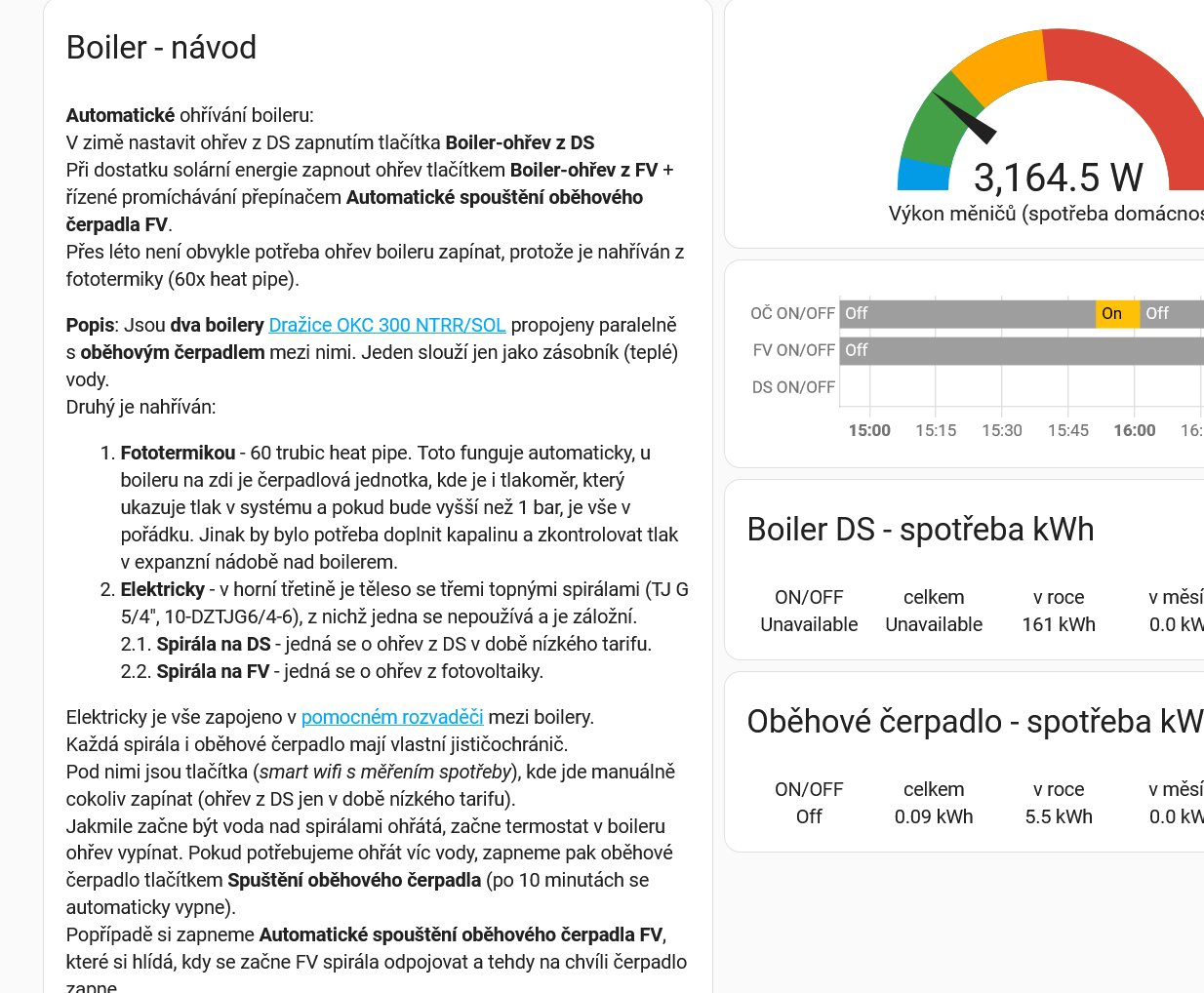 HA řídí elektrárnu a spotřebiče. Pro přehlednost si do něj ukládám i odkazy na manuály výrobce a schémata zapojení. Dále návody na údržbu různých zařízení v domácnosti, nějak takto: