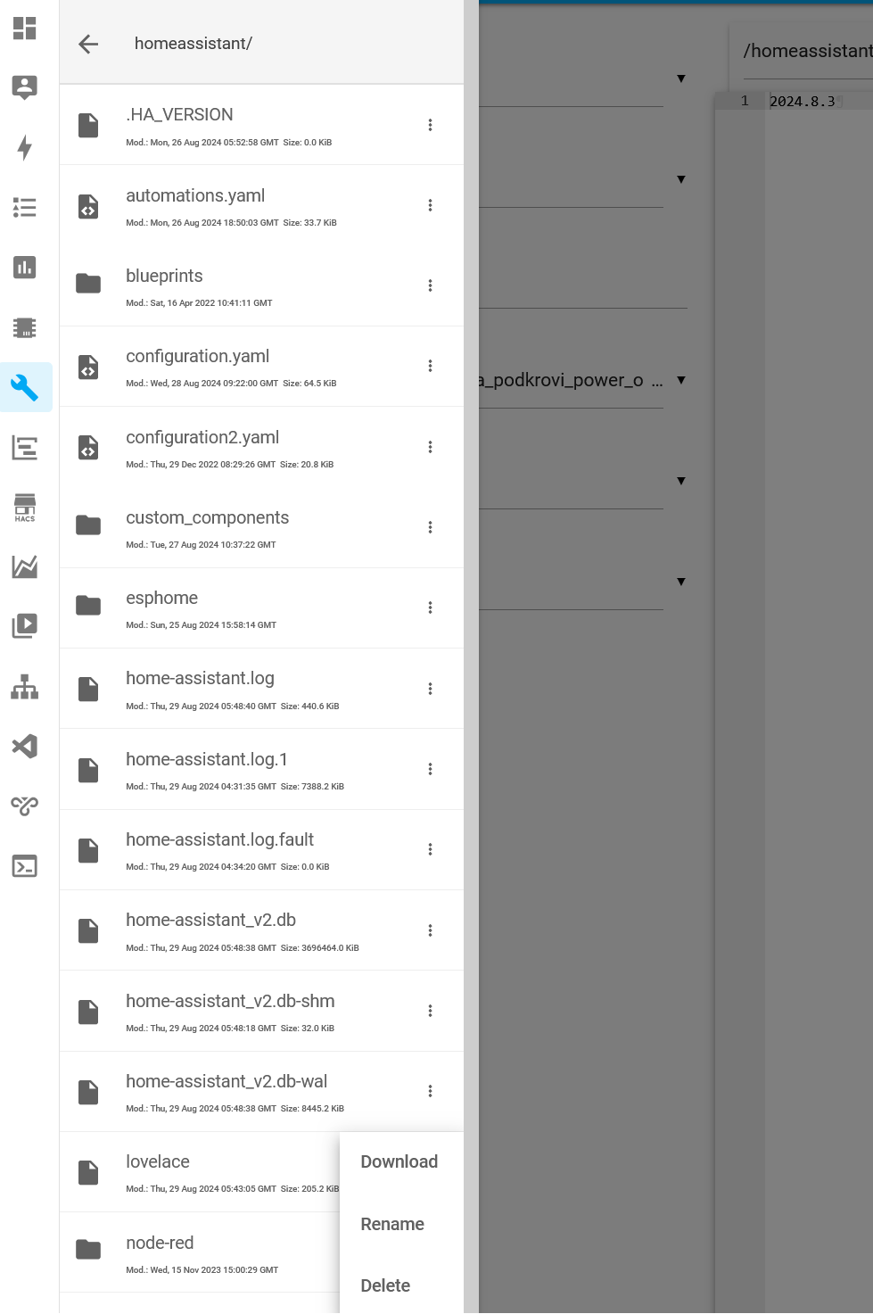 V HA spustím File editor, najdu kopii souboru, kliknu pravým tlačítkem na trojtečku vpravo od něj a download soubor do vhodného umístění: