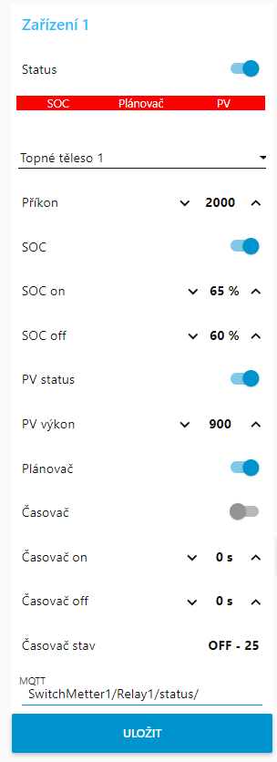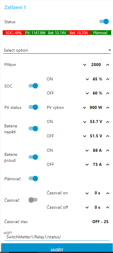 nasledne jsem si udelal mensi nastrel zakladniho nastaveni pro zarizeni, aneb moznost spoustet podle SOC, výkonu z panelů popřípadě podle rozvrhu, horni lista indikuje, zda je dana podminka splnena (seda=deaktivovana,cervena=nesplnena, zelena=splnena) ... časovač slouží ke spoždění pro spuštění popřípadě pro vypnutí ...