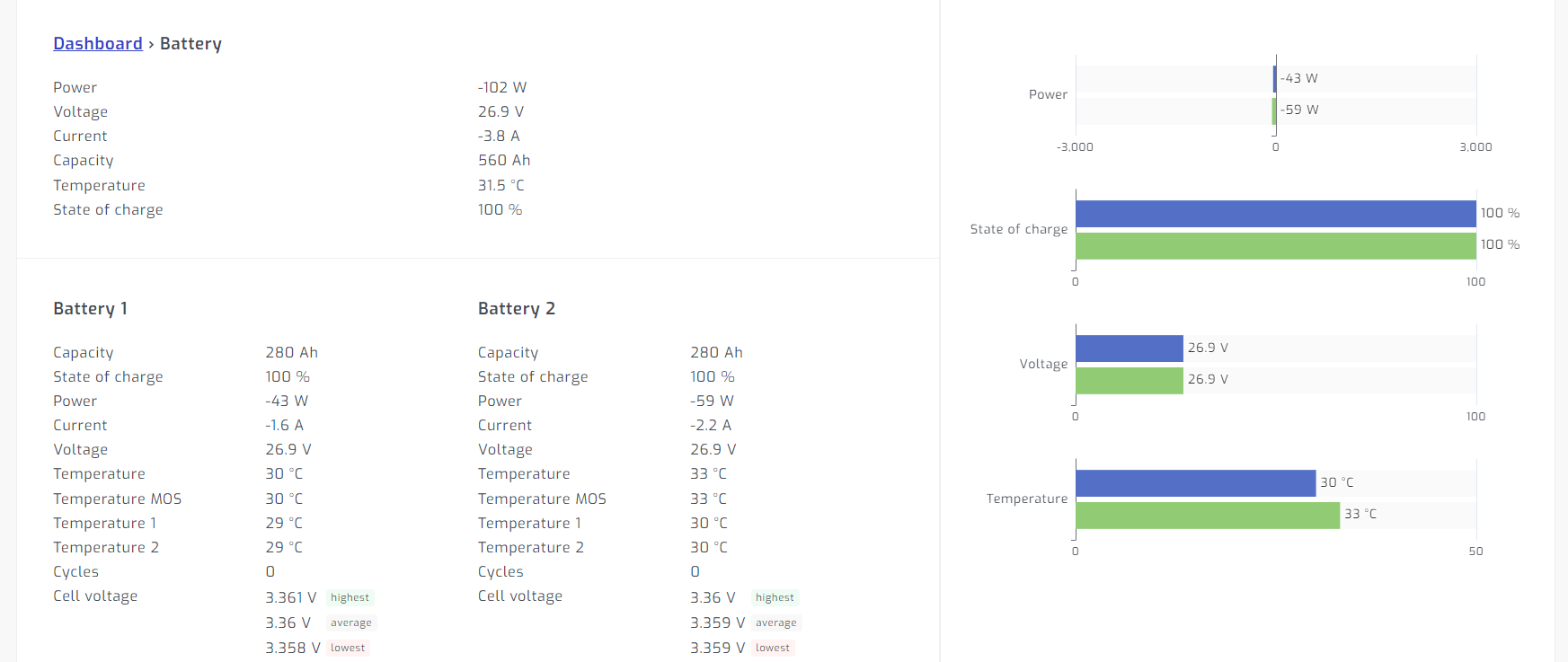 Tak od pátku zprovozněno lifepo4 24V/560Ah. i nebyl problém zprovoznit komunikaci do SA. Mám tedy hezký přehled o celé elektrárně.