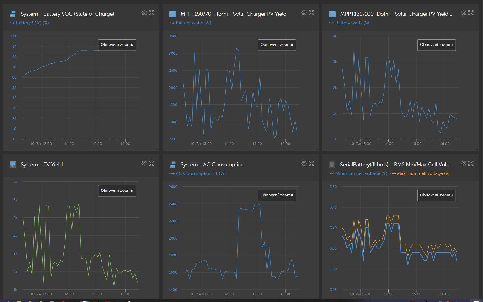 5,4 kWp JJZ 4deg,1,8kWp JV 24deg, do 13.8.2022 bylo 3,6 kWp, MPII 5k, Victron MPPT 250/85-TR, aku 9,45 kWh Lion 15S, BMS 200A, Smart Shunt 500A.