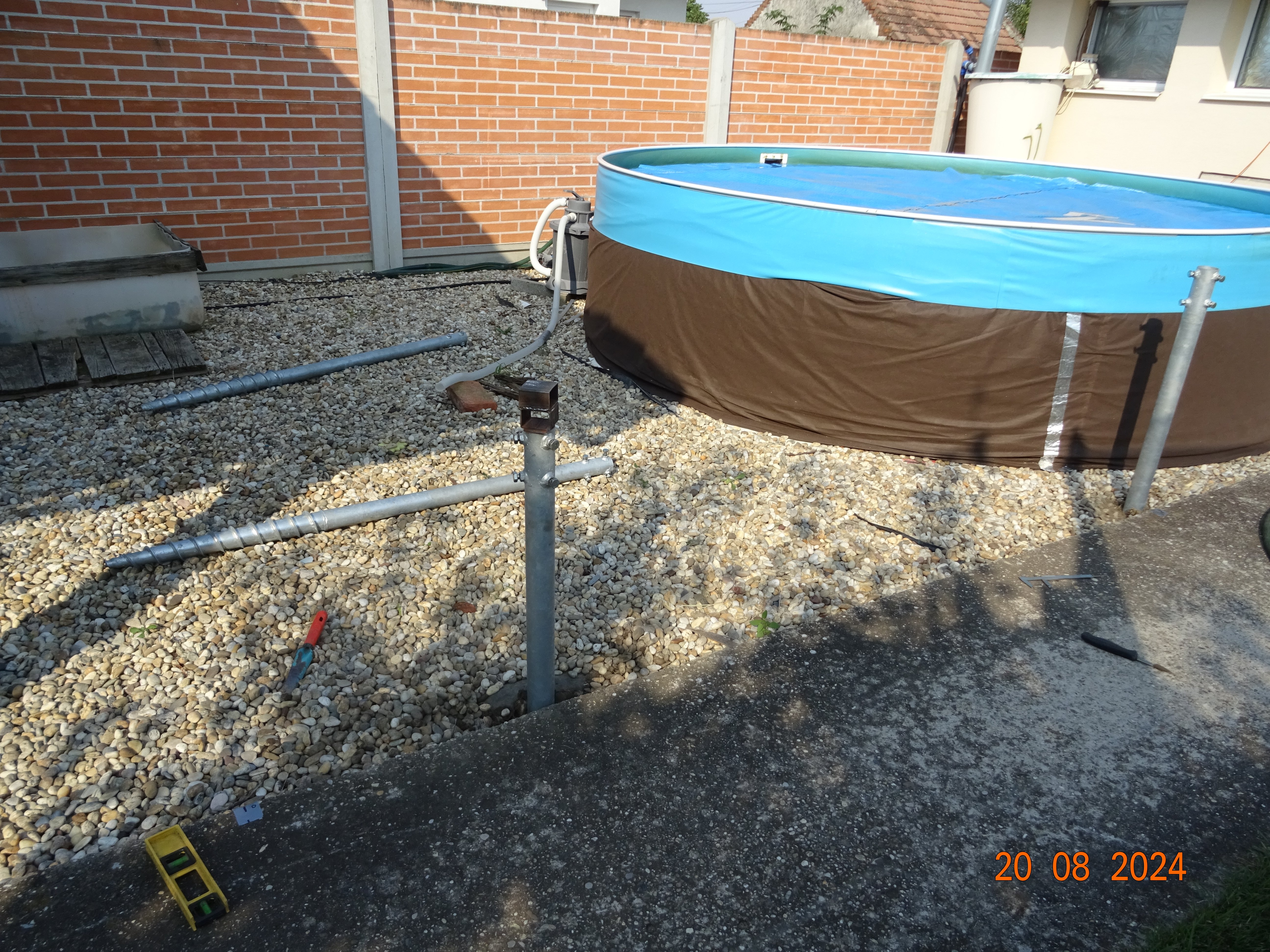 Nakoľko všetky zmysluplné strechy mám už obsadené, pýtalo sa jedno miesto medzi domom a dielňou, toto: Tak som to pomeral, veľa nocí v hlave všetko plánoval, predstavoval si a riešil detailíky a keď bolo všetko pred vnútorným zrakom dokonale premyslené, sadol k autocadu, navrhol ľahkú zváranú konštrukciu z oceľových profilov IPE 80 (I 80 má šikmé vnútorné steny a bol by problém so skrutkami cez profily) a lešenárskych rúr, nejakú obrázky a rozmeráky nakreslil a ohlásil to ako drobnú stavbu na stavebný úrad. Zmestilo by sa tam viac panelov, ale nemohol som prekročiť 25m2, aby to bolo na ohlášku a nelozili mi úradníci po dvore, tak som to navrhol na 9x575Wp z bifaciálnych panelov. Šalamúnsky som to v žiadosti nazval „Strieška nad chodníkom a bazénom so sklolaminátovým prekrytím“ čo je v podstate naprosto správne a bez zavádzania. Kým došiel súhlas, pokupoval som materiál a v najväčších letných horúčavách som sa pustil do práce.