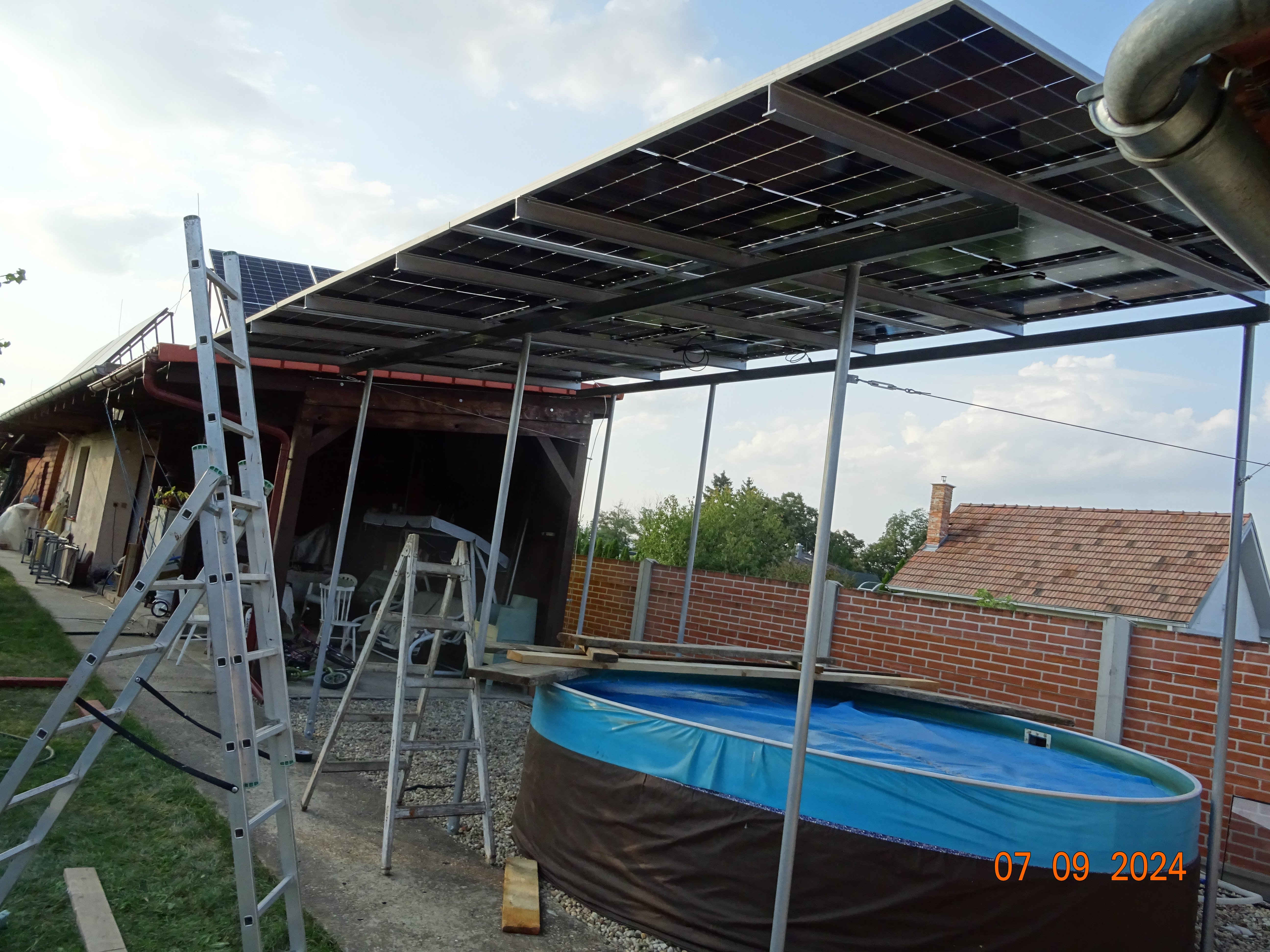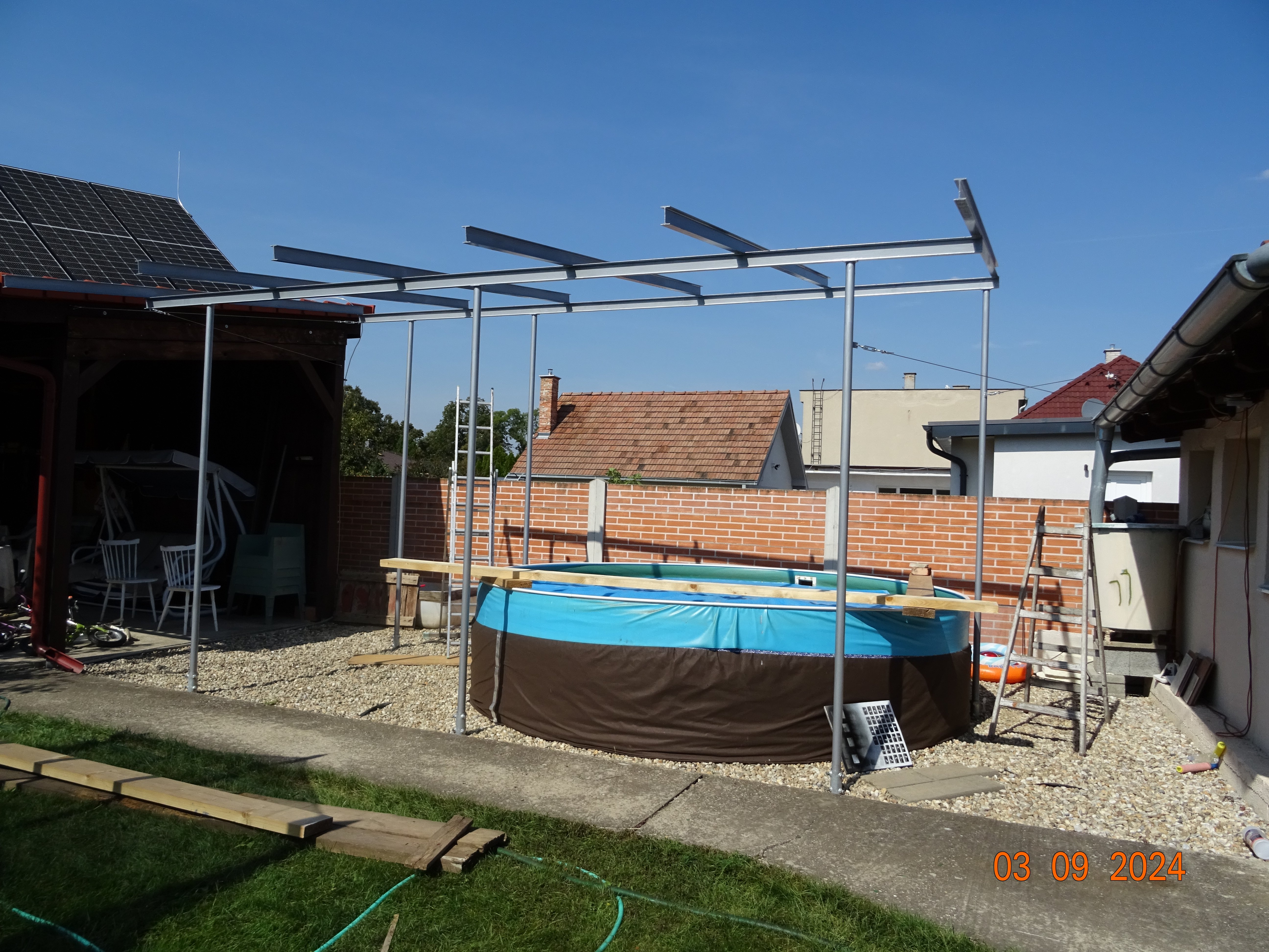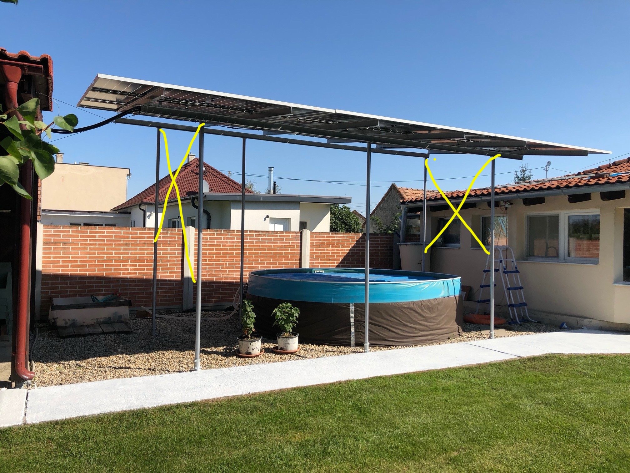 Nakoľko všetky zmysluplné strechy mám už obsadené, pýtalo sa jedno miesto medzi domom a dielňou, toto: Tak som to pomeral, veľa nocí v hlave všetko plánoval, predstavoval si a riešil detailíky a keď bolo všetko pred vnútorným zrakom dokonale premyslené, sadol k autocadu, navrhol ľahkú zváranú konštrukciu z oceľových profilov IPE 80 (I 80 má šikmé vnútorné steny a bol by problém so skrutkami cez profily) a lešenárskych rúr, nejakú obrázky a rozmeráky nakreslil a ohlásil to ako drobnú stavbu na stavebný úrad. Zmestilo by sa tam viac panelov, ale nemohol som prekročiť 25m2, aby to bolo na ohlášku a nelozili mi úradníci po dvore, tak som to navrhol na 9x575Wp z bifaciálnych panelov. Šalamúnsky som to v žiadosti nazval „Strieška nad chodníkom a bazénom so sklolaminátovým prekrytím“ čo je v podstate naprosto správne a bez zavádzania. Kým došiel súhlas, pokupoval som materiál a v najväčších letných horúčavách som sa pustil do práce.