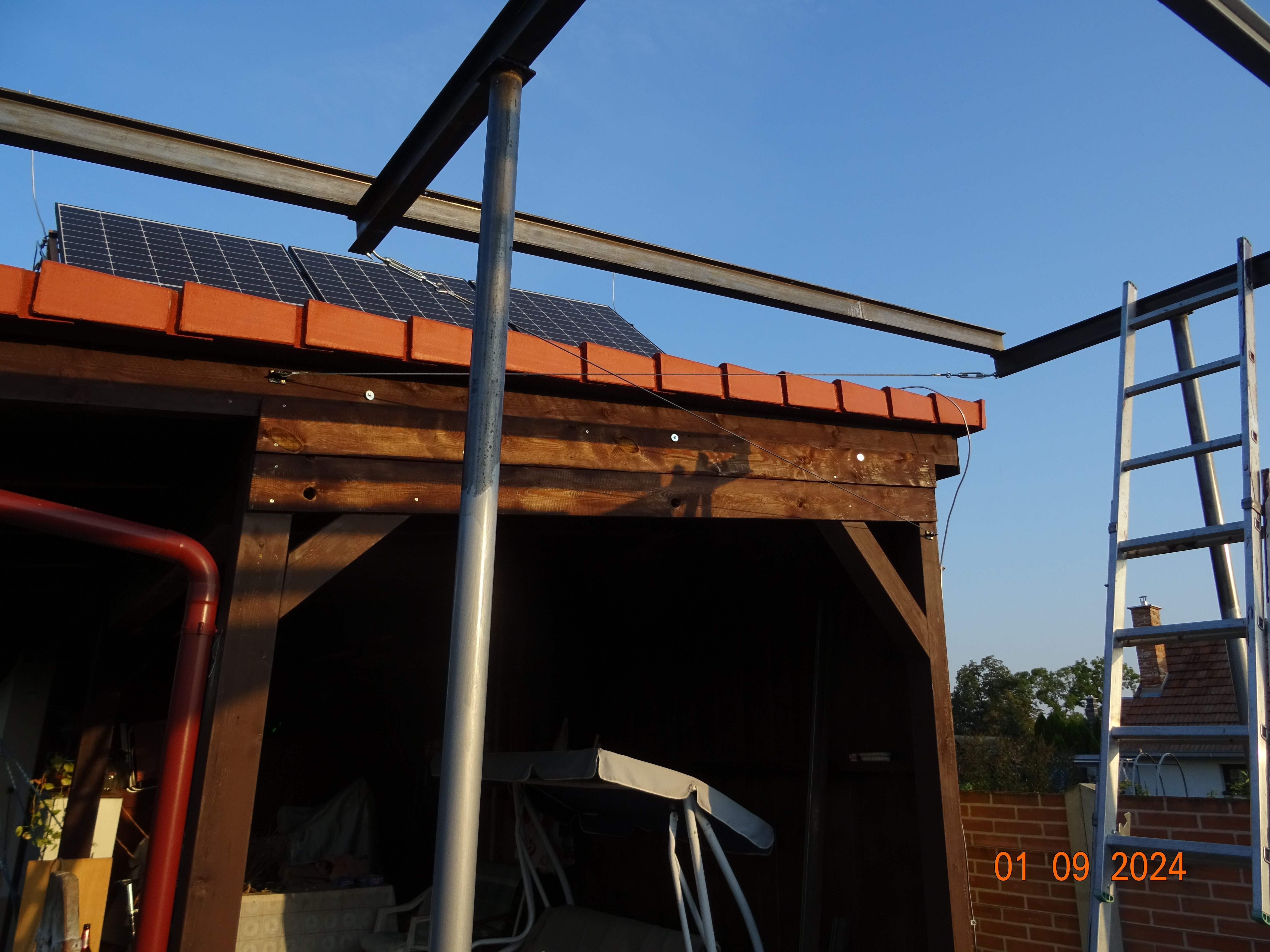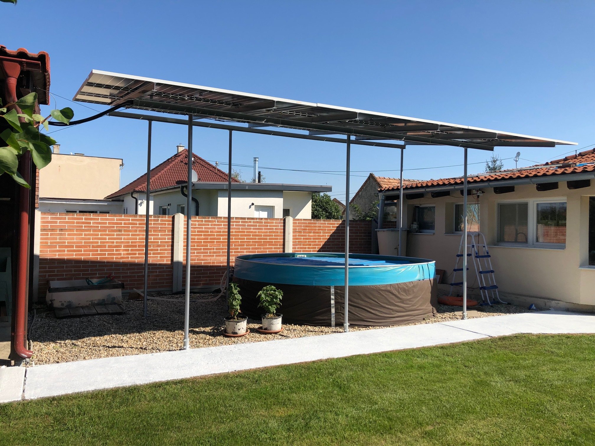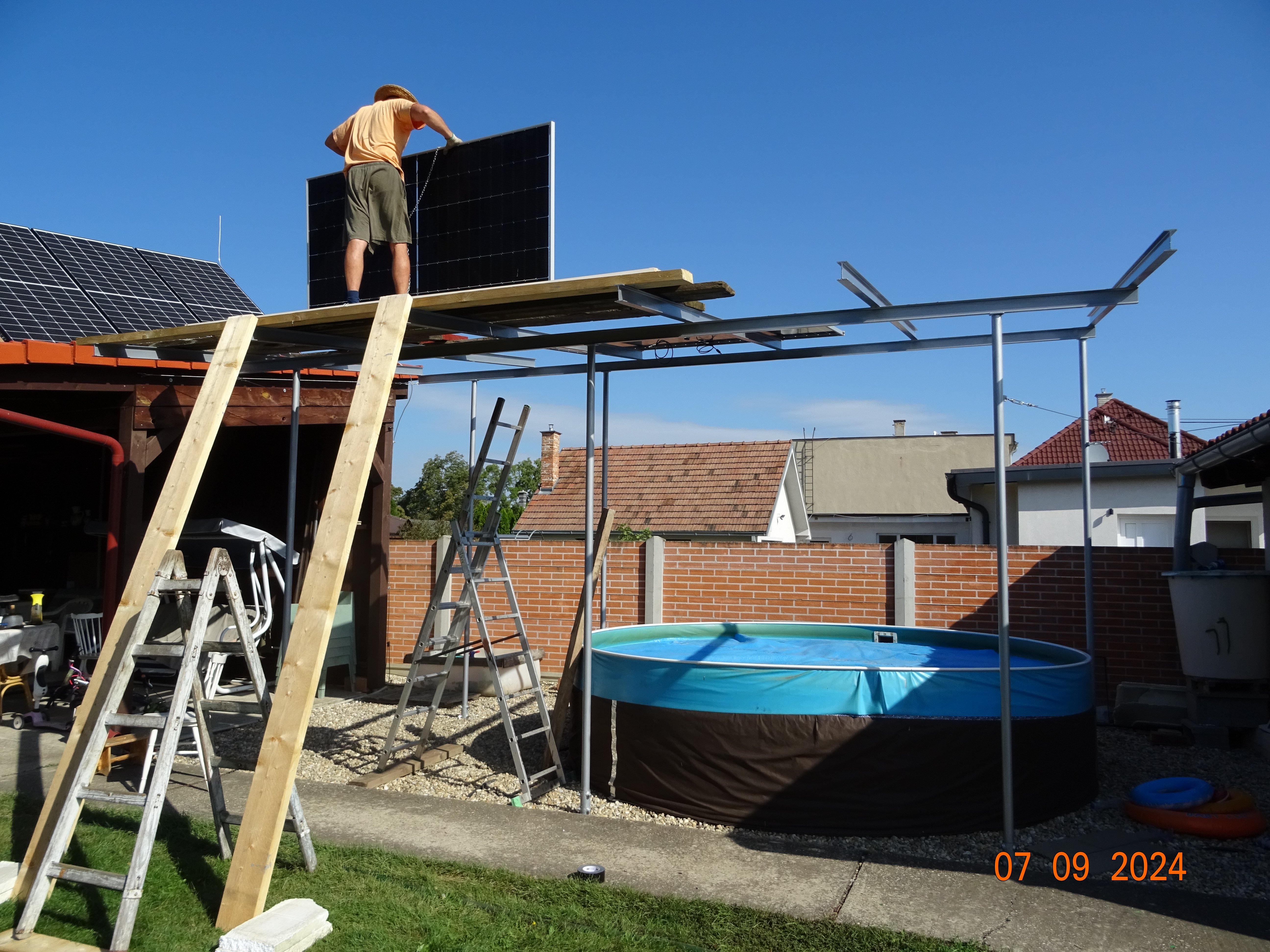 Nakoľko všetky zmysluplné strechy mám už obsadené, pýtalo sa jedno miesto medzi domom a dielňou, toto: Tak som to pomeral, veľa nocí v hlave všetko plánoval, predstavoval si a riešil detailíky a keď bolo všetko pred vnútorným zrakom dokonale premyslené, sadol k autocadu, navrhol ľahkú zváranú konštrukciu z oceľových profilov IPE 80 (I 80 má šikmé vnútorné steny a bol by problém so skrutkami cez profily) a lešenárskych rúr, nejakú obrázky a rozmeráky nakreslil a ohlásil to ako drobnú stavbu na stavebný úrad. Zmestilo by sa tam viac panelov, ale nemohol som prekročiť 25m2, aby to bolo na ohlášku a nelozili mi úradníci po dvore, tak som to navrhol na 9x575Wp z bifaciálnych panelov. Šalamúnsky som to v žiadosti nazval „Strieška nad chodníkom a bazénom so sklolaminátovým prekrytím“ čo je v podstate naprosto správne a bez zavádzania. Kým došiel súhlas, pokupoval som materiál a v najväčších letných horúčavách som sa pustil do práce.