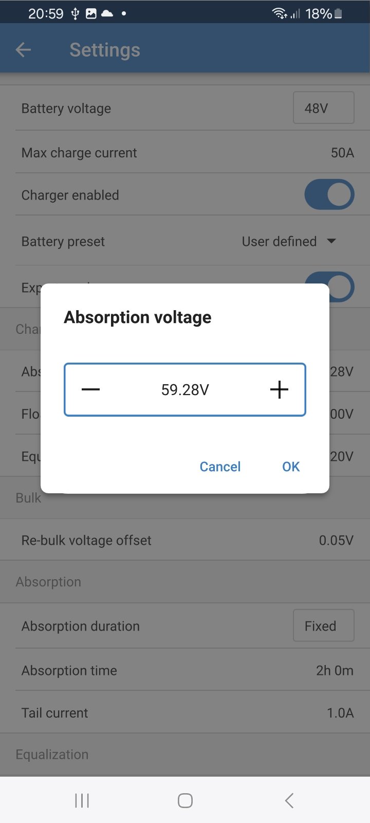 Já když to sleduji, tak do ABS jedou oba na své maximum co dají panely, pokud dosáhnou konečného napětí tak se podělí o výkon, pak přejdou do float a dle velikosti odběru se taky dělí o výkon, někdy jede 1 když to stíhá držet na floatu, popřípadě se i sami prohodí. Pokud jede jeden naplnoa druhý na třeba 1/3 tak zkusit ubrat nějaké mV tomu co víc vyrábí. Může tam být ztráta na vodičích a při lithium technologií pak rozdíl 30-50mV pak může být velký rozdíl proudu z mppt. Někde mám i DVCC zaplé.cipis píše: pon zář 23, 2024 10:00 pmNemám to právě na volné noze, mám nastavené řízení dle BMS. Takže si Victron přímo řídí ty regly ...