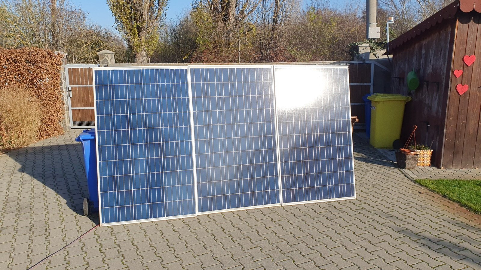 Tak za 1:hlavní smysl byl u mne stín,protože pod tím polykarbonátem se nedalo vydržet.Což se povedlo,účel to splnilo.Panely nejsou odnikud vidět,pouze z okna ve štítu,takže nehyzdí okolí nějakou konstrukcí navíc.
