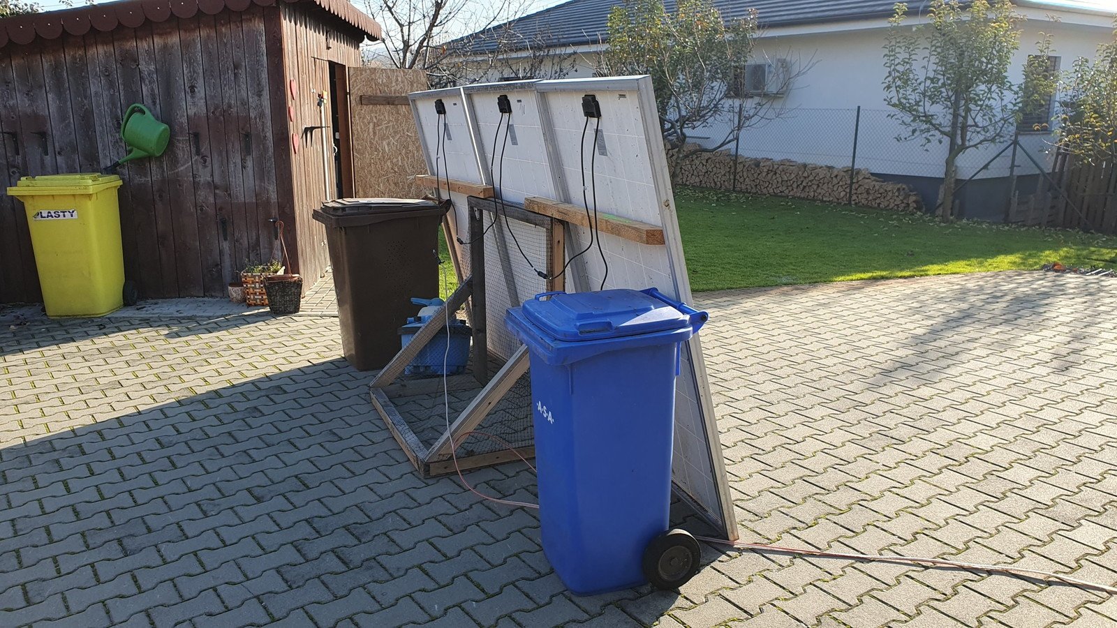 Tak za 1:hlavní smysl byl u mne stín,protože pod tím polykarbonátem se nedalo vydržet.Což se povedlo,účel to splnilo.Panely nejsou odnikud vidět,pouze z okna ve štítu,takže nehyzdí okolí nějakou konstrukcí navíc.
