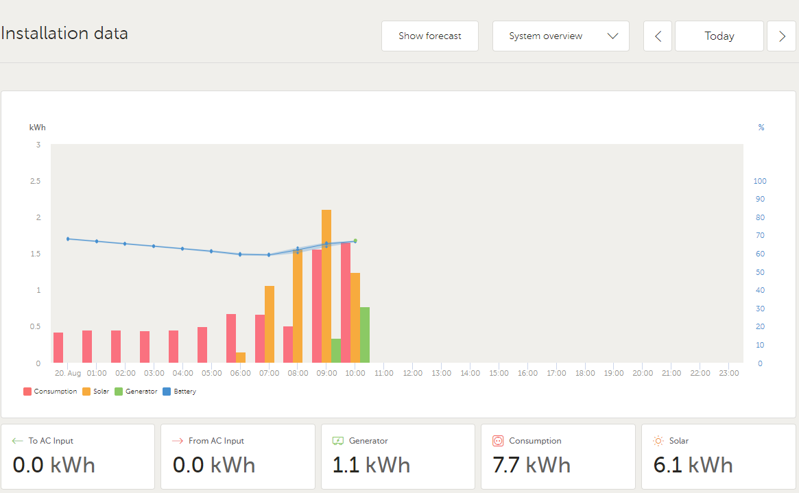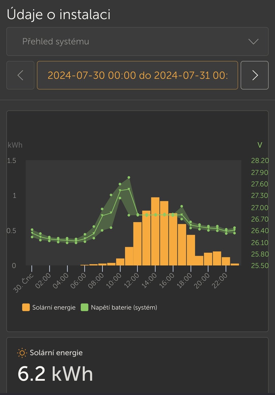 Dokud jsem měl připojené jedno MPPT, tak to zobrazovalo správně, ale po připojení více MPPT už se celková energie nezobrazuje na základní obrazovce VRM a zobrazuje se jen čárový graf.