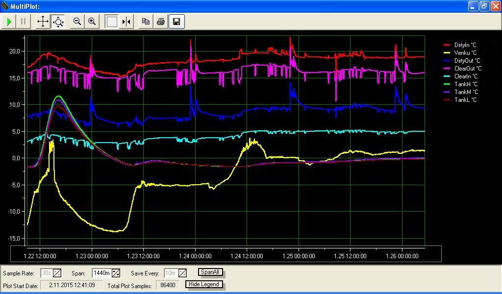 Mám rekuperaci již od minulého století. Navíc mám sání čistého vzduchu do rekuperátoru provedeno přes zemní registr, který zajišťuje, že rekuperátor v našich podmínkách nezamrzne a přidává (nebo v létě ubírá) čistému vzduchu potřebné teplo. Průběhy teplot v chladném období vypadají takto:Vitek píše: