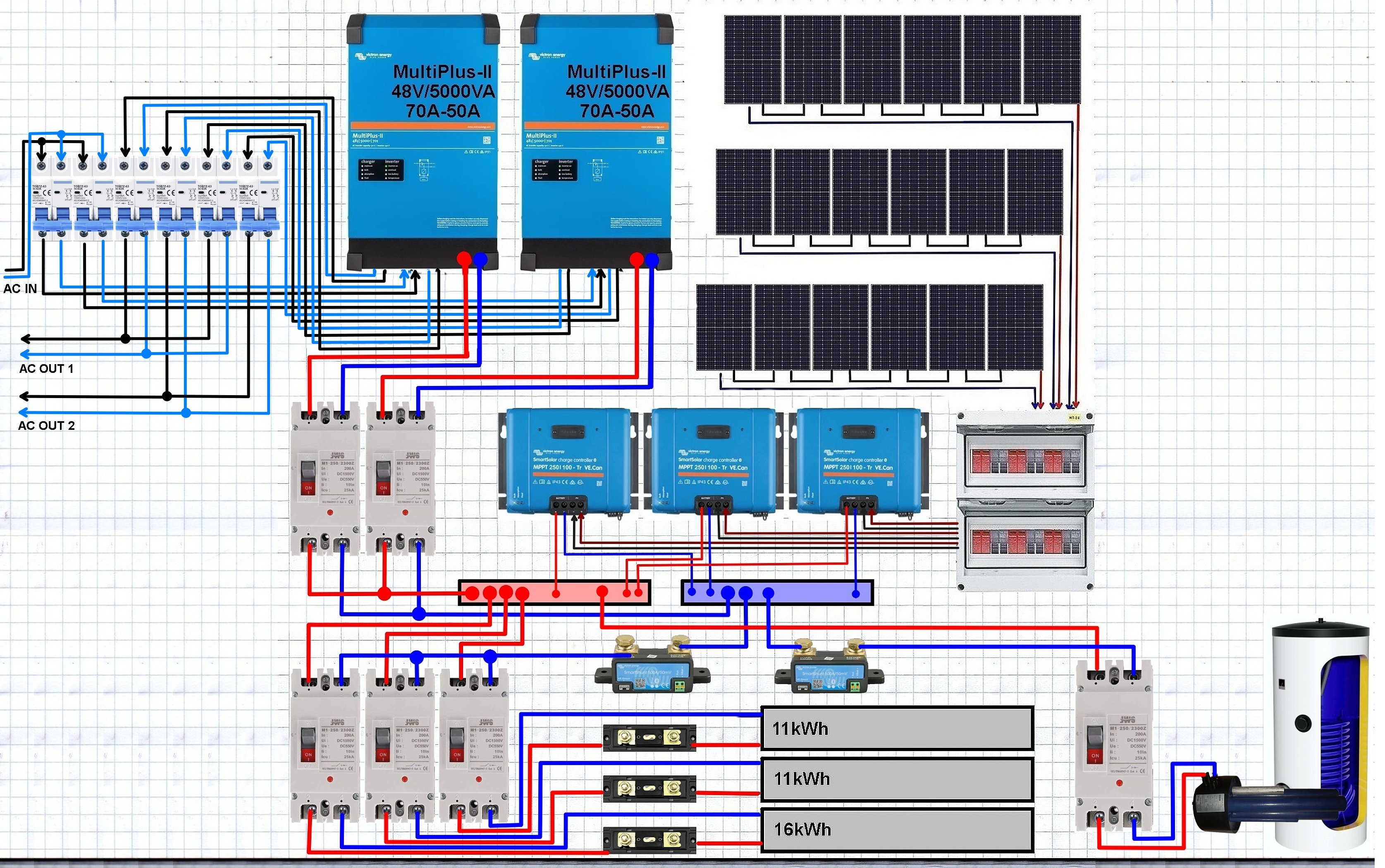9,2kWp JV 45°, 4,6kWp JZ 45°, 2,3kWp JV 90°, 2 x Victron MP II 5kVA, 3 x SmartSolar 150/70, Smartshunt, Cerbo, 16x280Ah + 16X300Ah + 16x300Ah LiFePO4 + 3xJK BMS.