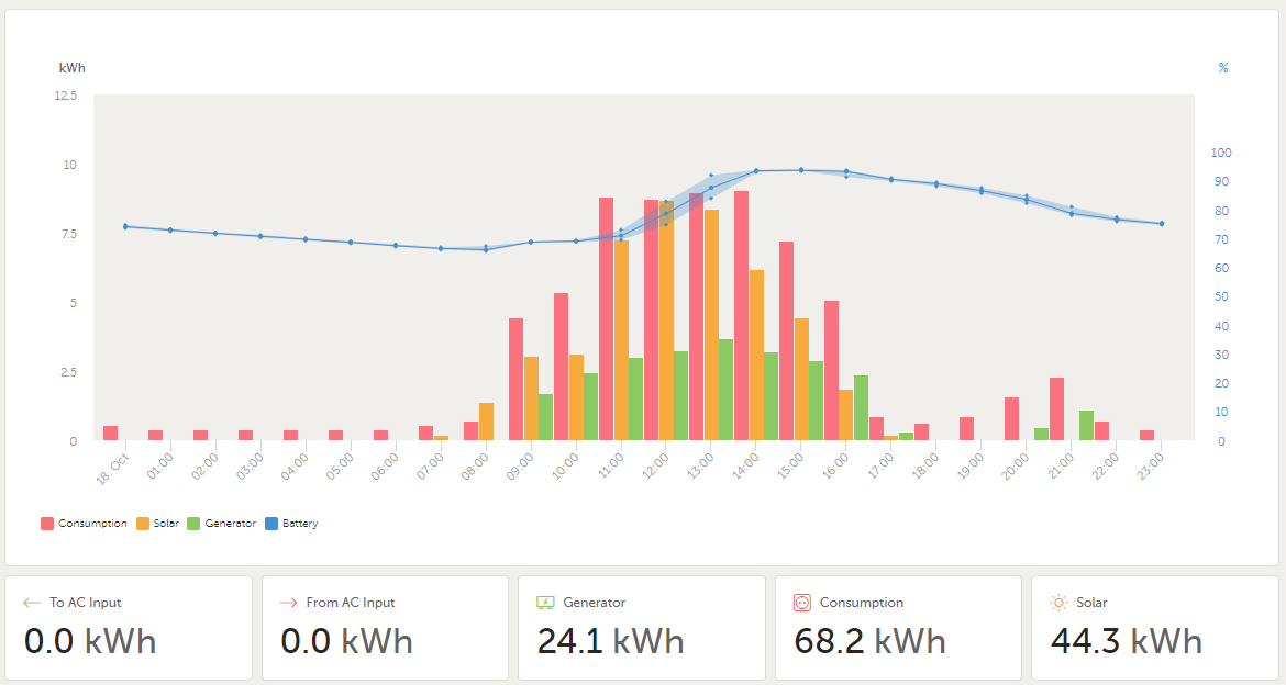 Mě to tedy připočítává, data ze včerejška, na začátku dne SoC 74%, na konci 75%, takže stejné. Ze střechy 44,3kWh, ale spotřeba 68,2kWh, to by odpovídalo těm 24kWh, co dodal generátor. Síť mám stále odpojenou.Paulob píše: sob říj 19, 2024 12:54 amTohle tady čtu často a už jsem se k tomu i někde vyjadřoval a nechápu proč si tohle lidé myslí.