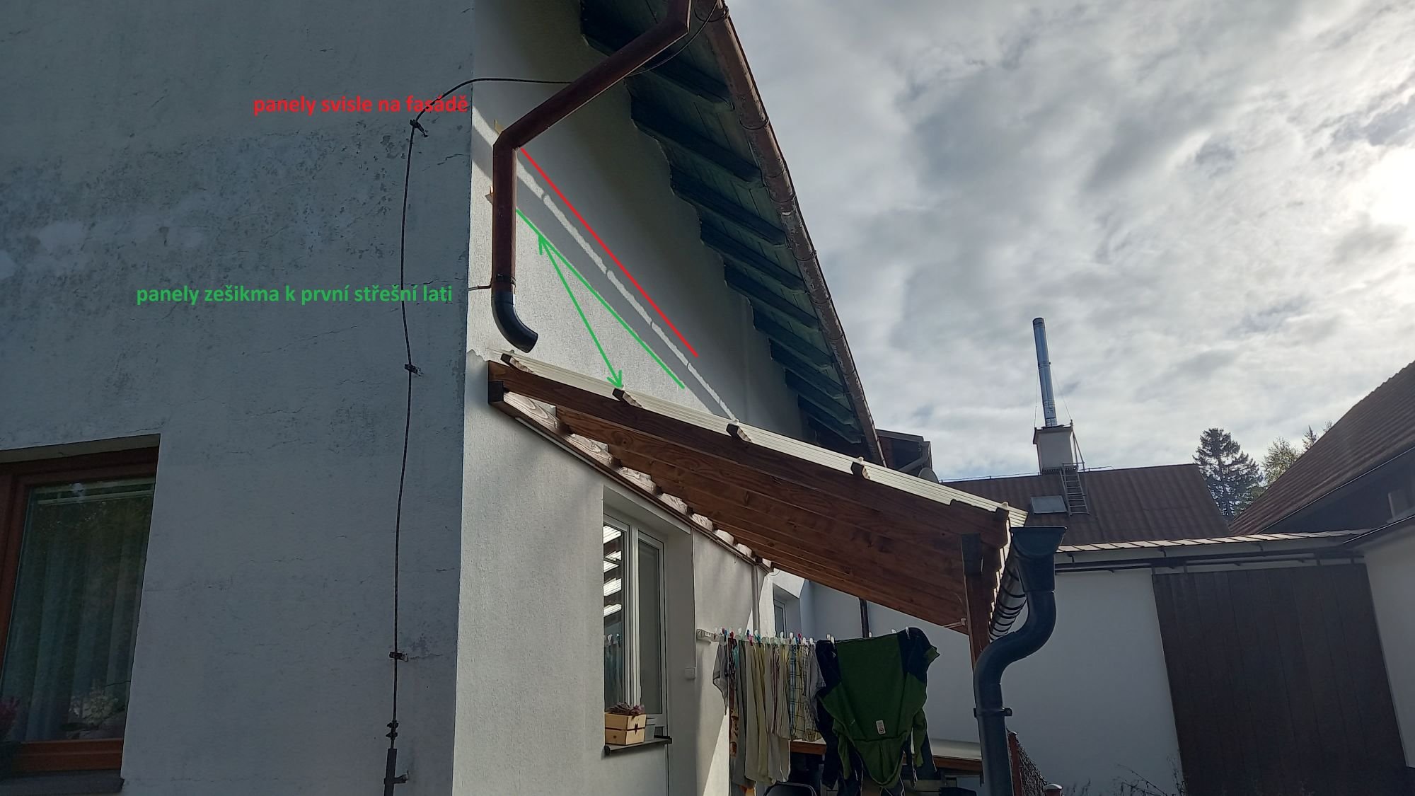Když dám panely zešikma na první lať přístřešku (zelená varianta), nebudu tolik stínit do obyváku a přitom budou panely méně zastíněné od okapu