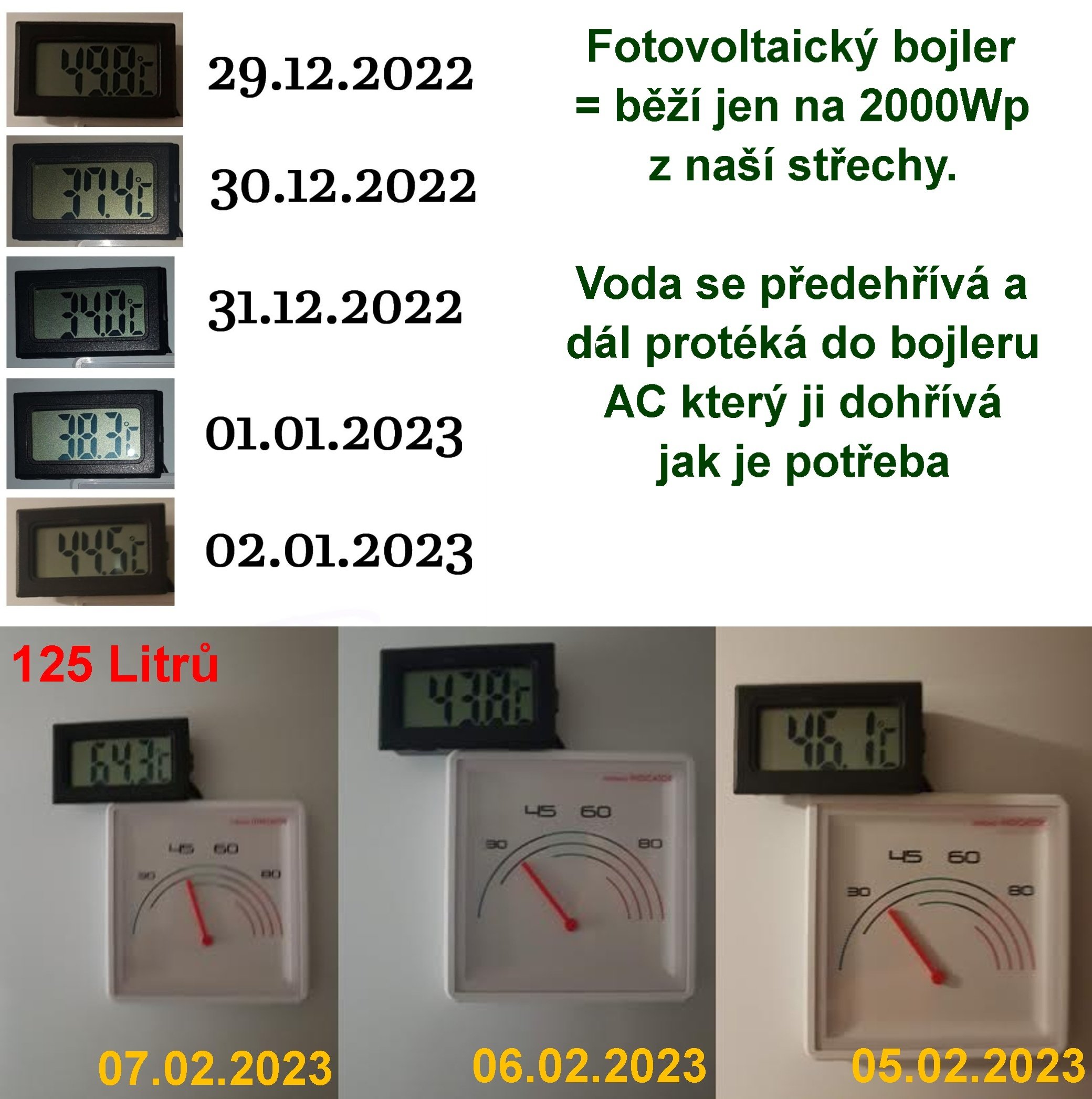 Pokud svítit nebude a bude jen nizká slabá oblačnost a panely vyrobí jen 2,5kWh za den, tak se teplota ve 125L zvedne jen o 15 Stupňů.