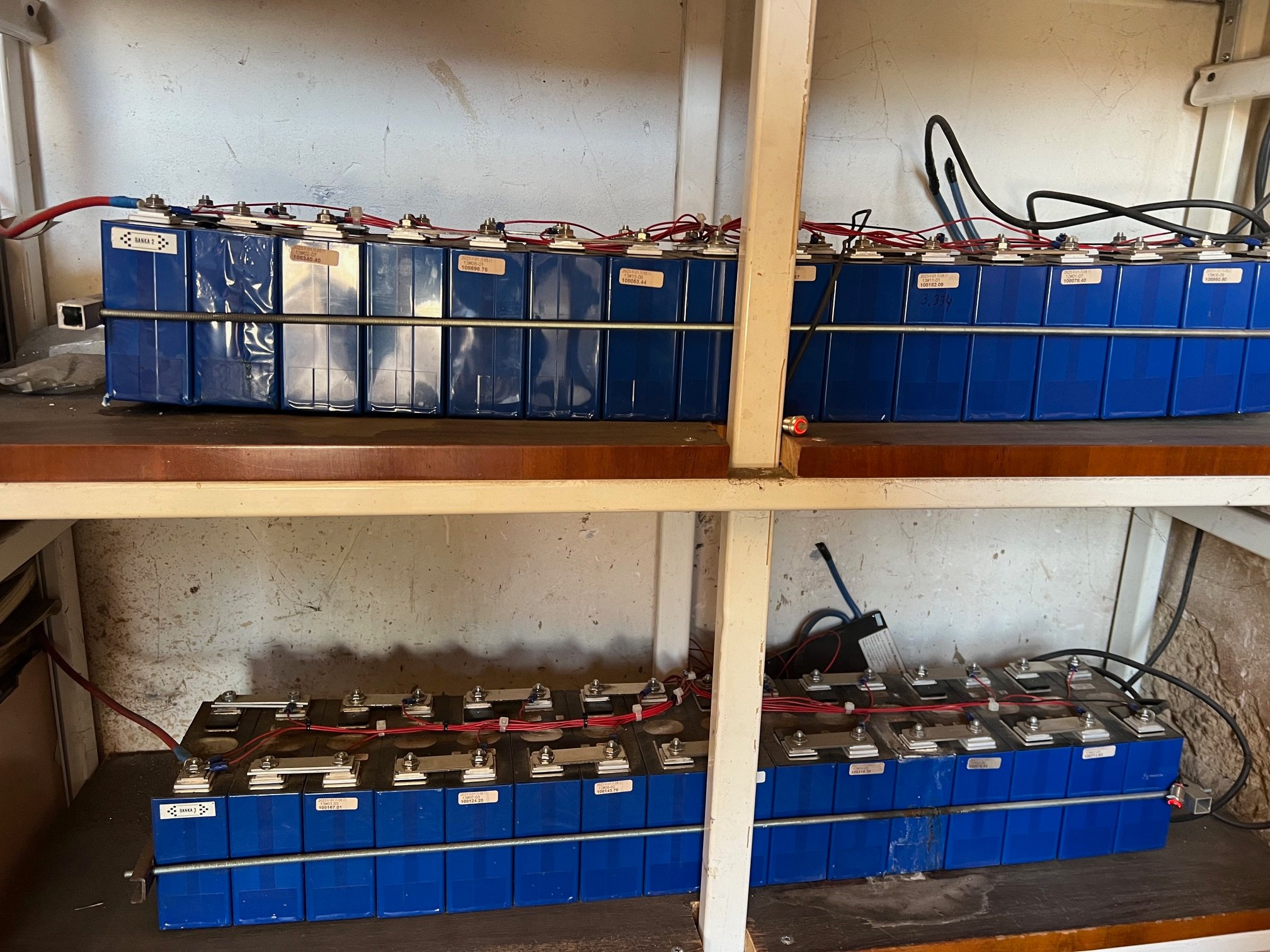 odborná práce nejmenované firmy. 3 ks 100Ah banky 3 modrásky 3 epevery trvale nabíjené na 58V. odběr jen na jedné fázi takže první banka byla držena do 54V. OStatní dvě jen havarijně odpojovány BMS pri 3,7V