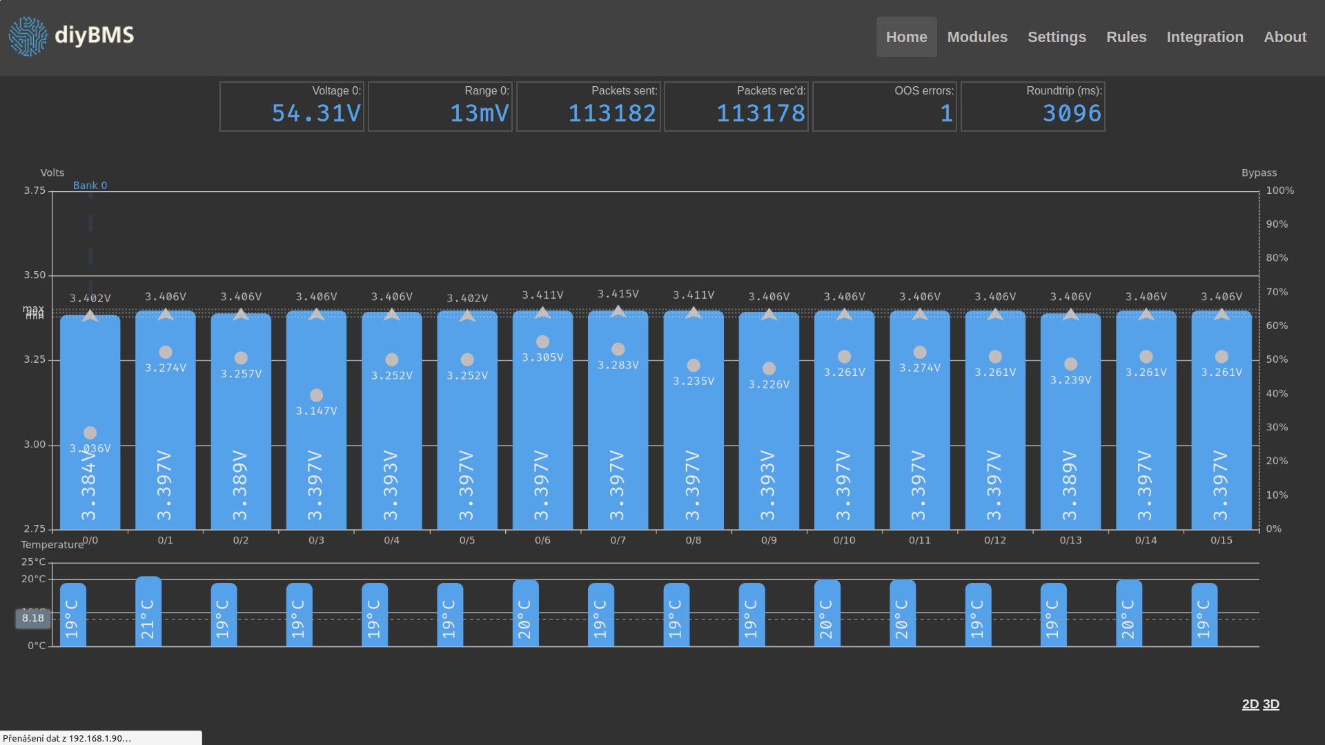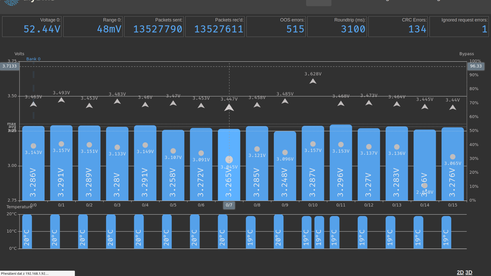 Už hodně dlouho (víc než rok, to je obžaloba) mám připravenej pack 16s2p z 60Ah winstonů, bazarovka, z r. 2018. Včera na mě začla kvičet BMs, že jeden článek je pod 3V. Tak jsem zapnul zdorj 55V 3A a dnes cca 10h po odpojení zdroje to vypadá takhle: BMS dokáže odcucnout 1.5A, teď mám nastavenej start balancování na 3.4V. Ten první článek k tomu ani nedošel (taky to byl ten nejvíc vybitej), a to se to rovnalo skoro 10 hodin. A je zajímavý, že i teď sem tam některej článek chce nad 3.4V, i když zdroj už je dávno vypnutej...