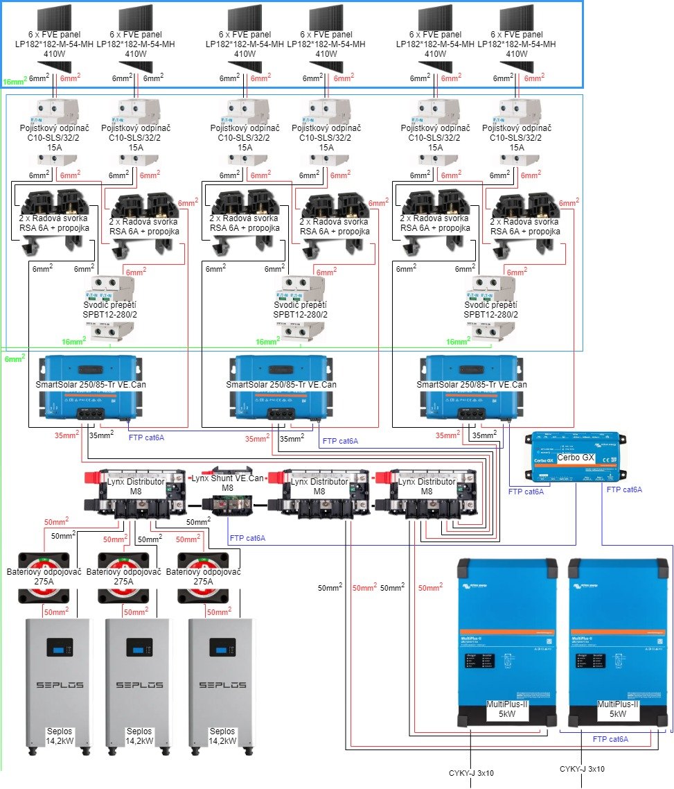 nejsem si jist, jestli je dobrej nápad dávat 6 panelů do série. Porušení ČSN 33 2000-7-712 - napětí do 120V Voc pro -45°C. Tohle zrovna nějak Victron neřeší, i když je to "evropskej výrobce". Nebo bys musel použít MPPT s hlídáním izplačního stavu -to victron taky umí, ale za jiný prachy (https://eshop.neosolar.cz/mppt-solarni- ... 0-100-mc4/ ). Tady spíš jde o koncepci systému, místo, případný stíny a strach z DC oblouku a vyhoření. Takže raděj víc mppt 150/100 a panely po dvou nebo třech, podle typu... Místo pojistkovejch odpínačů dej DC jističe, odpínače nejsou určeny pro laickou obsluhu... Ostatně stejně potřebuješ na DC rozvaděč prohlůášení o shodě a pod, viz navrhrozvadece.cz . Dva multiplusy jsou volba, když jeden odejde, dá se to zprovoznit i s jedním, ale samo se to nespustí bez druhýho, případně dokoupí třetí a má 3f systém.