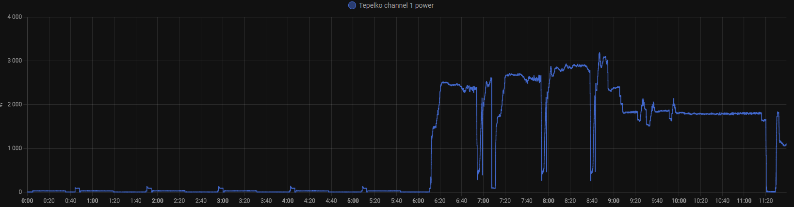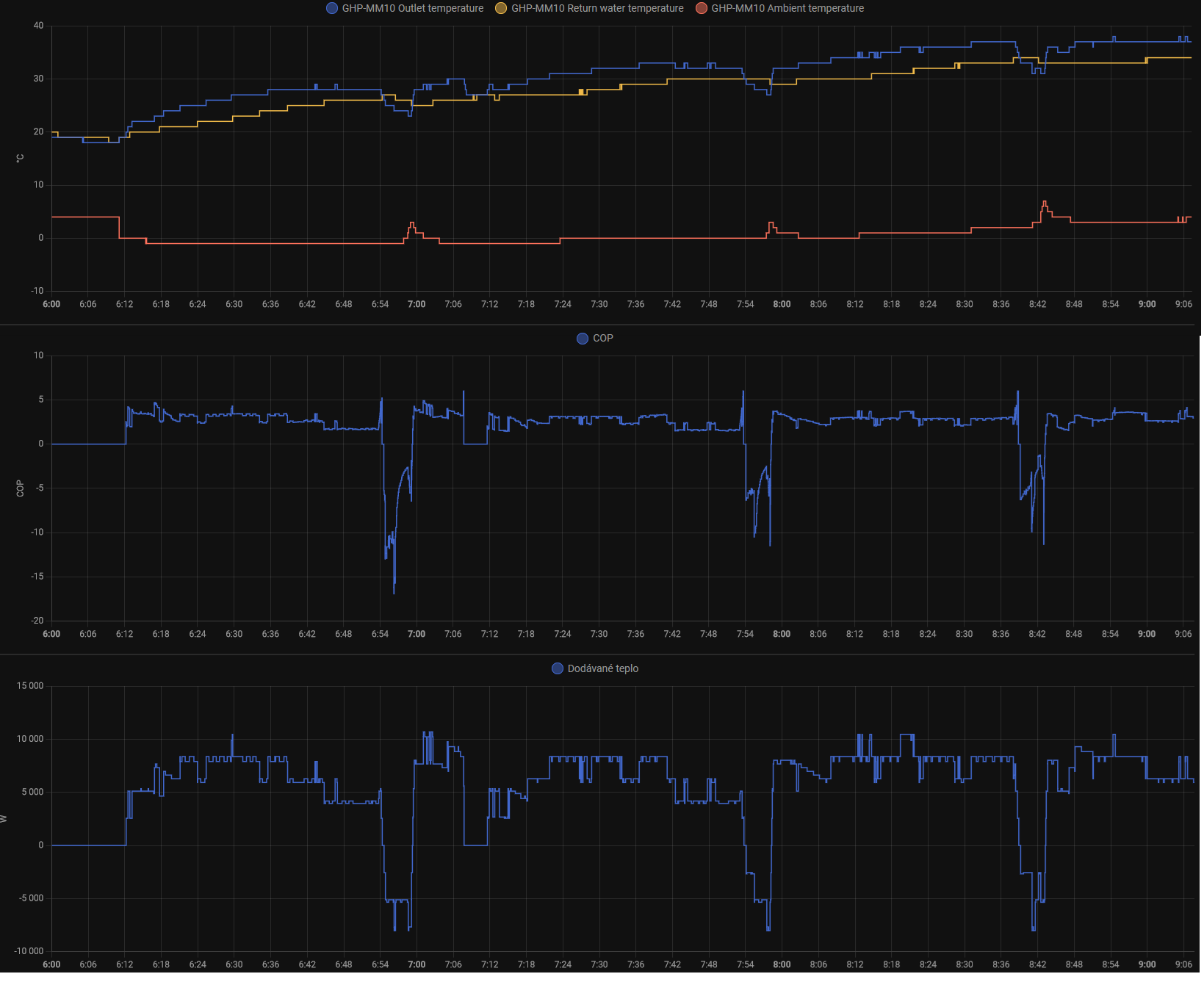 tady je odběr. Já to tepelko provozuju v režimu 50 až 100% a COP se pohybuje okolo 3,2 při 0° venku (mám tu 10kW verzi) největší problém když to tu sleduju je v tom, že na ty vaše podlahovky a baráky je i to 8kW tepelko strašně silné.