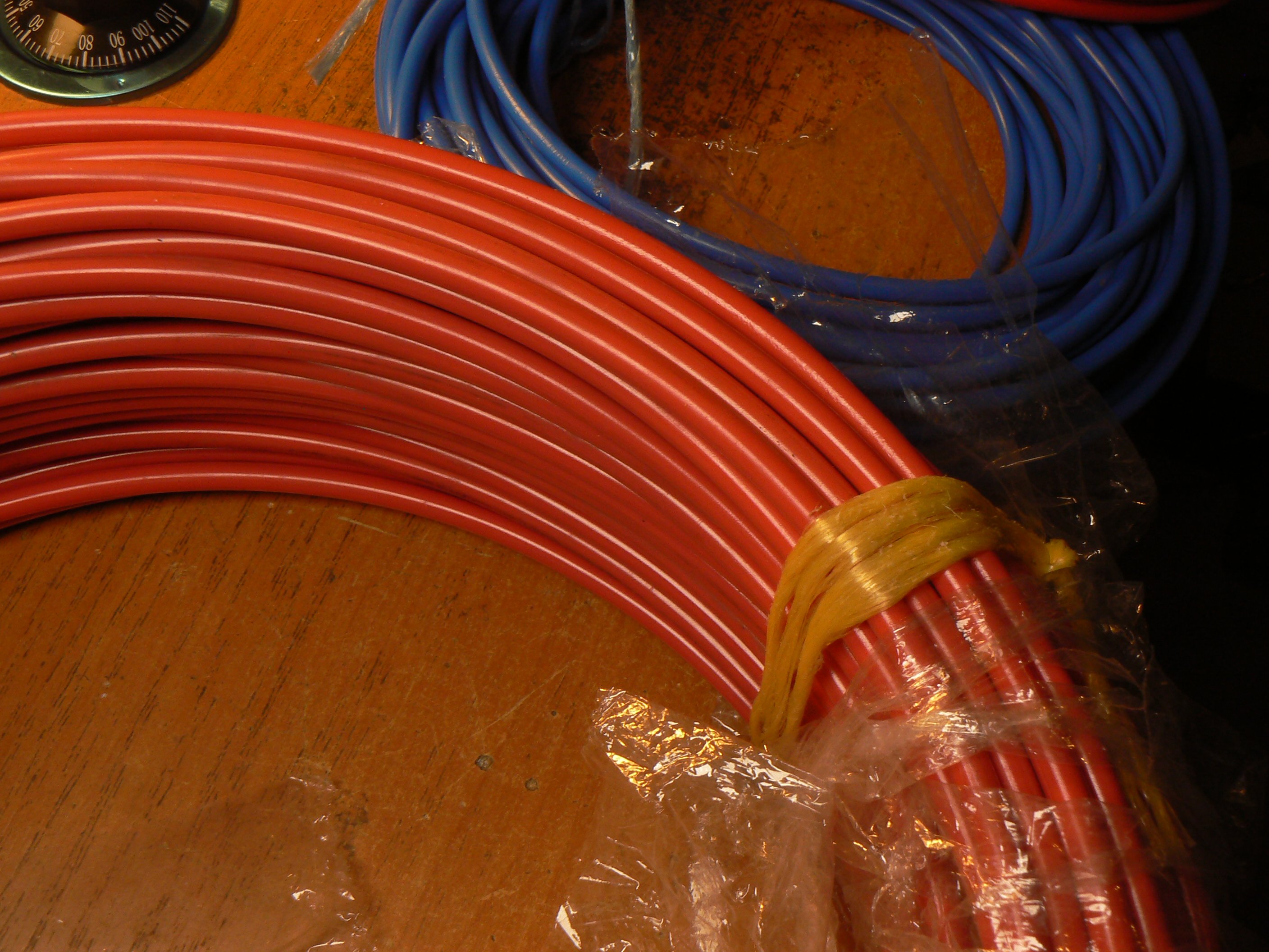 to je 11Kč /m, dále kabel lanko modrý 6mm2 cena za 10m je 110Kč to je 11Kč /m . Možná těch 6mm2 je více metrů neměřil jsem to přesně. Dále kabel červený tvrdý vodič 10mm2 cena za 1m je 18Kč, to je třetí fotka, možno si přát budˇ10m nebo 20m nebo 30m v celku. Všechny kabely byly vyrobené v ČR a jsou nové , nepoužité pro běžné napětí AC do 500V či max. 750V . Zkušební napětí u kabelů se uvádí 2000V. Dále dva termostaty jeden zakoupený v ČR a druhý v číně. Oba jsou nové, nepoužité a oba dva mají přepínací kontakty. 16A / 4A . 16A je myšleno jako rozpínací pro topení a 4A pro chlazení pro ventilátor. Oba dva jsou kapilární , délka kapiláry k sondě cca 0,8m jeden je vhodny jako havarujní má nastavitelný rozsah teploty až do 110°C. Druhý je myšlený jako provozní např. k bojleru s nastavitelnou