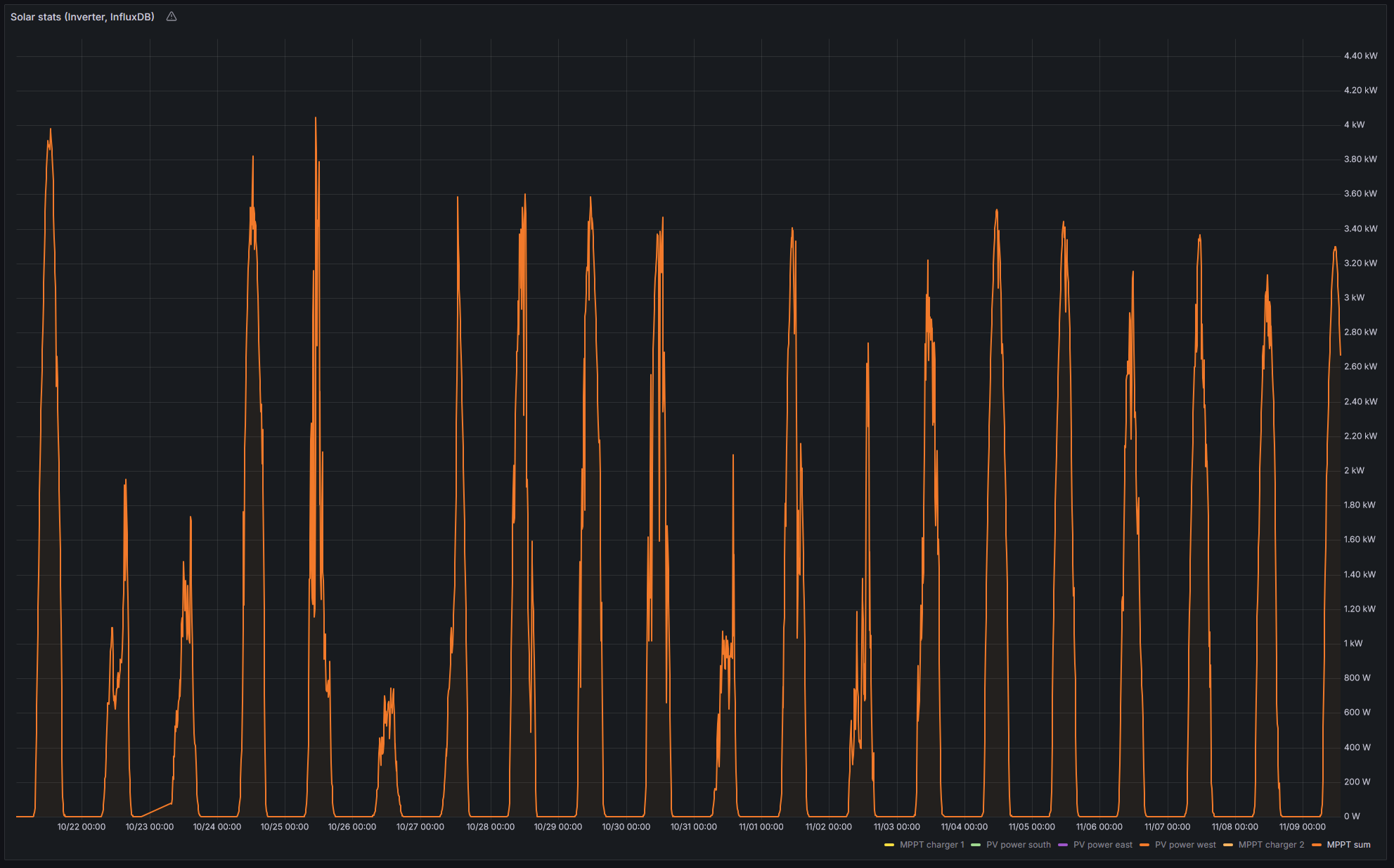 21.10. išlo z MPPT spolu 4 kW, dnes 9.11. pri úplne jasnej oblohe a zime už len 3.3 kW
