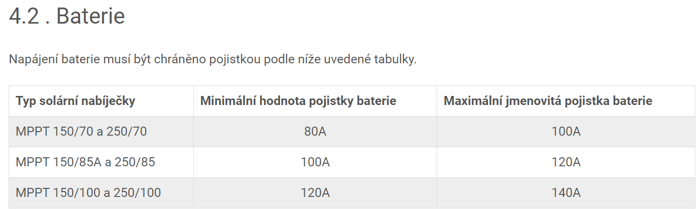 Taky jsem z těch pojistek lehce zmatený - jeden manuál píše min 120A max 140A na baterku, druhý doporučuje 200A na baterku - vše manuály Victron.