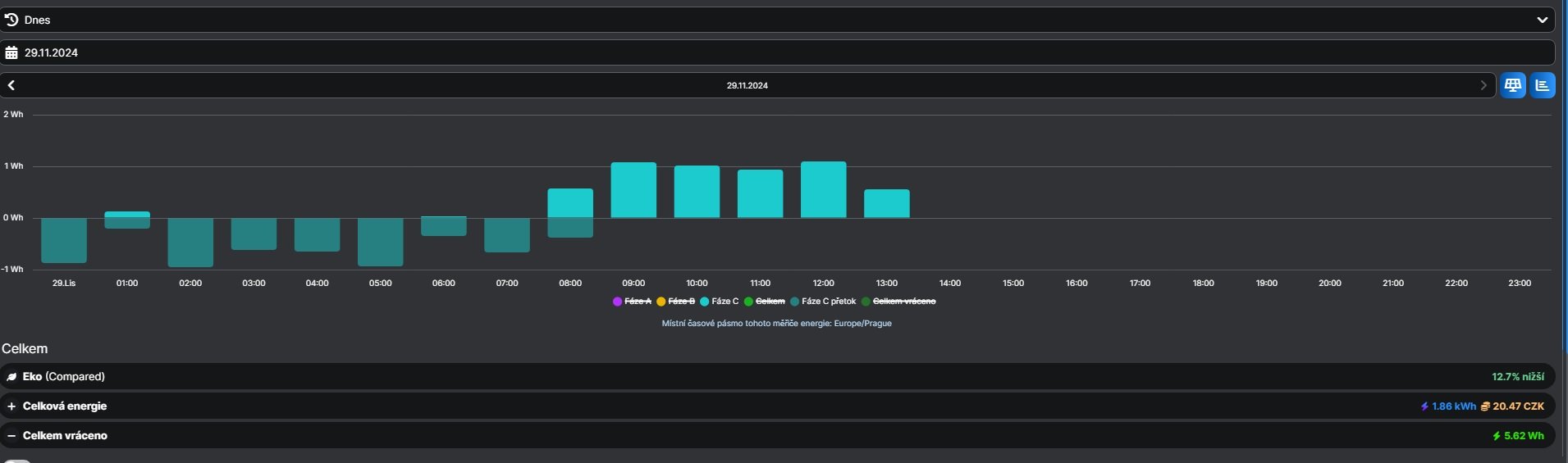 Ale vše zatím potvrzuje, že žádné přetoky opravdu nebudou, bere si neustále pro vlastní spotřebu něco z FV a i ze sítě 60-90W, i když spotřebu úplně vypnu, tak si myslím že to bude asi pravda a nic nepřetéká.