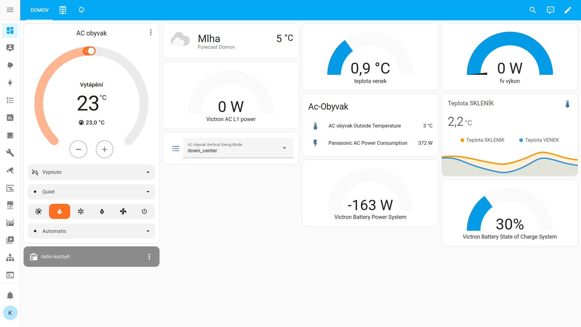 Akorát tam nemám polohu klapky, jde jenom zapnout "swing" ale poloha klapky je jako samostatná entita vedle, stejně jako ta teplota venkovní jednotky a spotřeba. Ty spotřeby si výhledově nechám napočítat jako kWh a zkusím to nějak vysledovat. Dnes topím klimou a přijde mi to jako celkem levný topení, možná i levnější než dřevo, který musíš koupit.