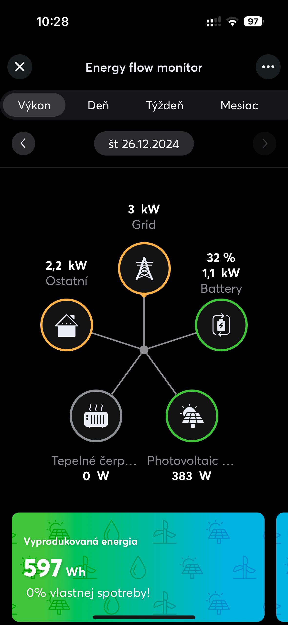Modelová situace je třeba že svítí slunce, elektrárna vyrábí 400-500w, spotřeba je kolem 1 kilowattu, ale stejně se dobíjí baterka ze sítě silou kolem 1 kw a třeba i více.