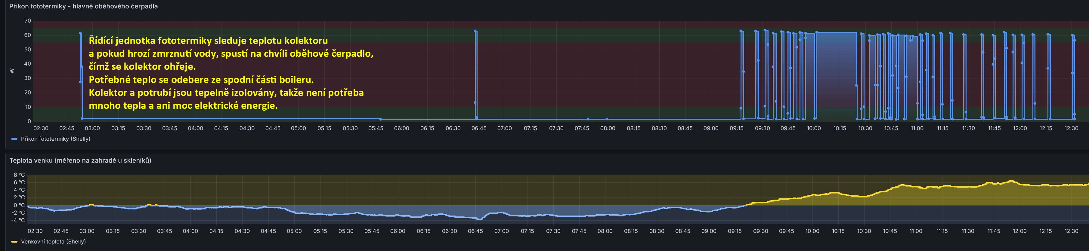 Teplota klesá pod nulu a protože mi ve fototermice (heat pipe) cirkuluje voda a ne nemrznoucí kapalina, můžu sledovat, jak energeticky náročné je zabránit vodě v zamrznutí. Řídící systém fototermiky sleduje teplotu v kolektoru a když klesne blízko nule, tak spustí oběhové čerpadlo a tím se kolektor ohřeje. Za dnešní noci toto proběhlo 2x.
