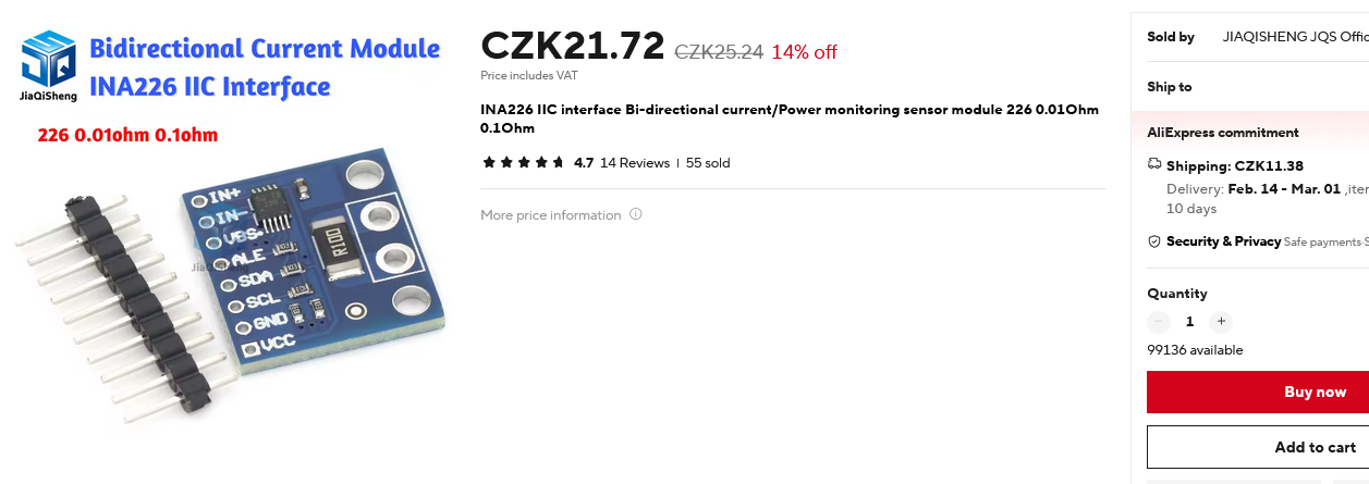 # ina226 proud počítá z rozdílu napětí na bočníku. Pro lepší přesnost a rozlišení je vhodné volit bočník tak, aby napětí na něm nebylo moc malé (a samozřejmě nepřesáhlo dovolené napětí čipu)