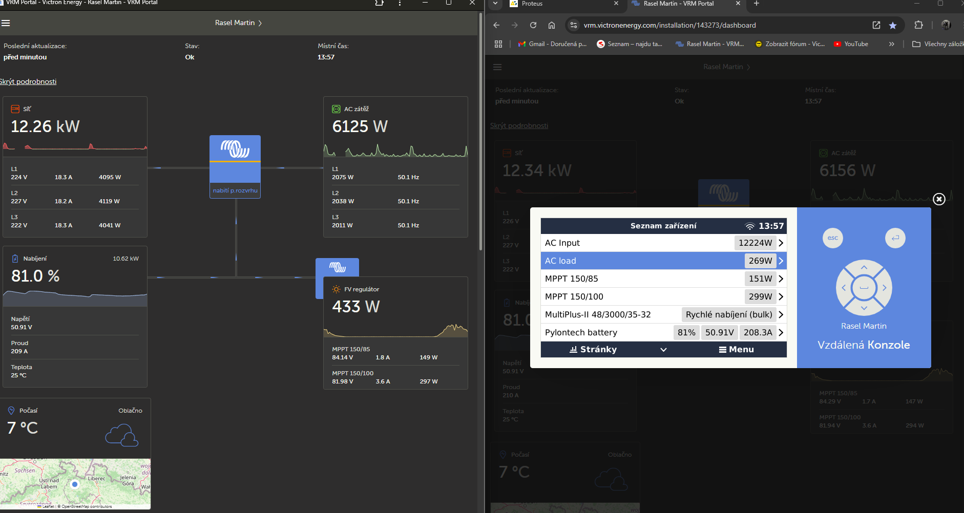 Jde o to, že VRM ukazuje jiné hodnoty(ty nepravdivé) než konzole, která ukazuje správně. Děje se to při nabíjení ze sítě, jde třebas 12kw sítě, do baterek jde nějakých 10,62 kw. V tu současnou dobu jde do AC zátěže 6,125kw. Což je přesně půlka ze sítě. ale v domě nic neběží, což ukazuje správně konzole.