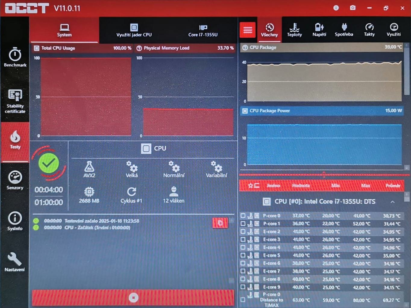 Měřením zjištěno, že změřený příkon miniPC při 100% zatížení procesoru byl 41W z napájení 230V. Průměr 36W.