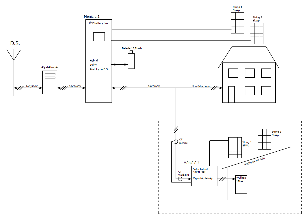 Když pominu ekonomickou návratnost (kW které nepůjdou do auta, když nebude připojené zůstanou na střeše), zajímá mě jestli by to takto mohlo fungovat. Hlavně ty dva střídače zapojené za sebou. Teoreticky by měnič č. 2 se měl chovat jako spotřebič pro měnič č. 1.
