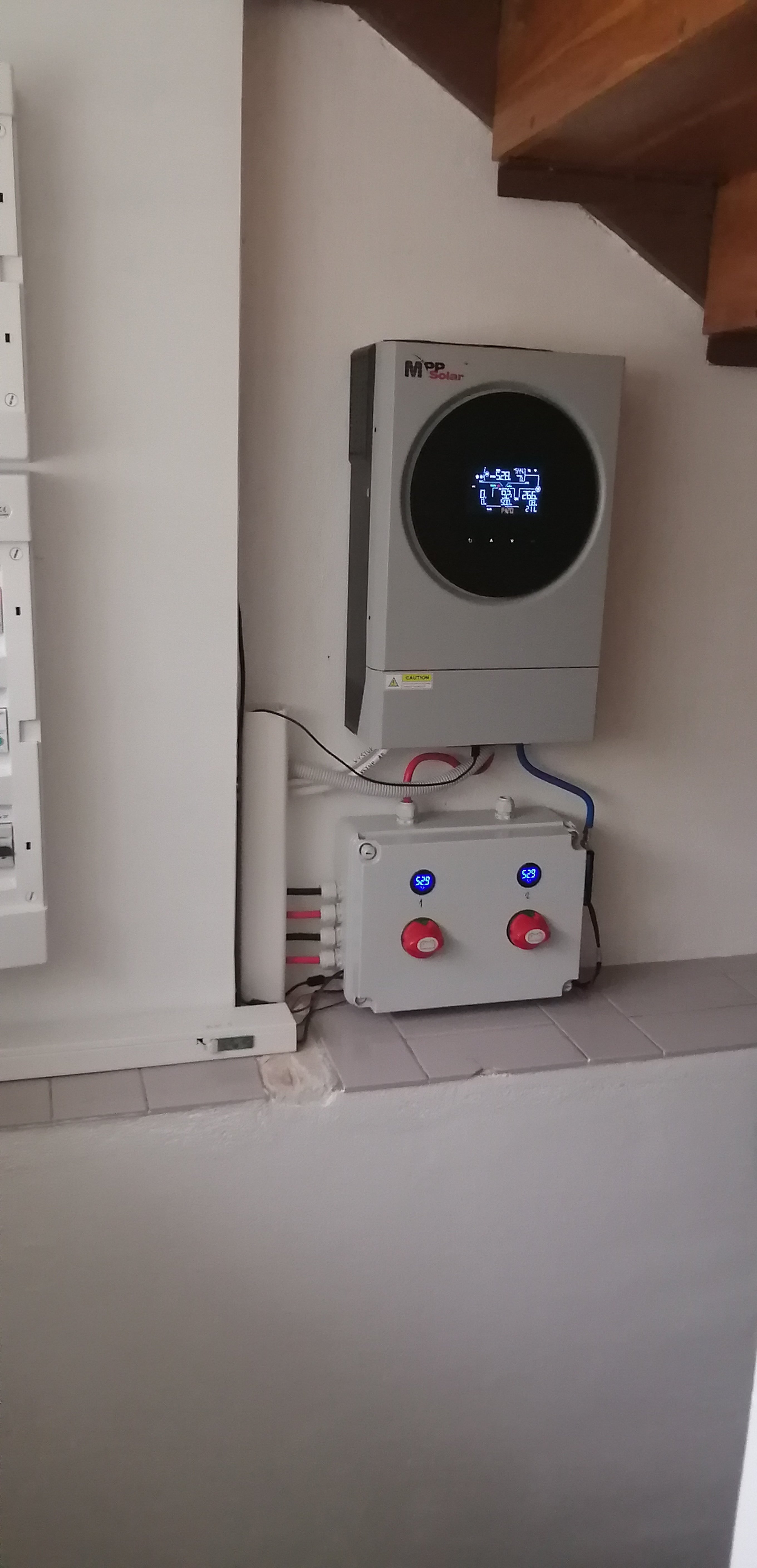 Nejdříve děkuji za nepřeberné množství informací a zkušeností které od vás čerpám od 02. 2022. Moje instalace zatím: 7s 380wp Ja solar, měnič MPP Solar U 5648GK, bat. 2x 16s 120Ah. Přikládám nějaké foto z instalace. Střecha sklon 55st, orientace 13st na jiho-východ. Výtěžnost 95%. Rozvaděč jsem se rozhodl předělat, instalace z 80tých let, naštěstí TN-S. Nyní připojeno, funguji v ostrovním režimu, monitoruji přes Solar Assistant - na RPi4 jsem čekal do 20.9.. ale dočkal. Jinak jsem ve stadiu dodělávek a bojuji se sháněním DCSG ke Greenbonu Acu a s jeho konfigurací. Boiler 100l 1500w zatím řídím ručně 8-)