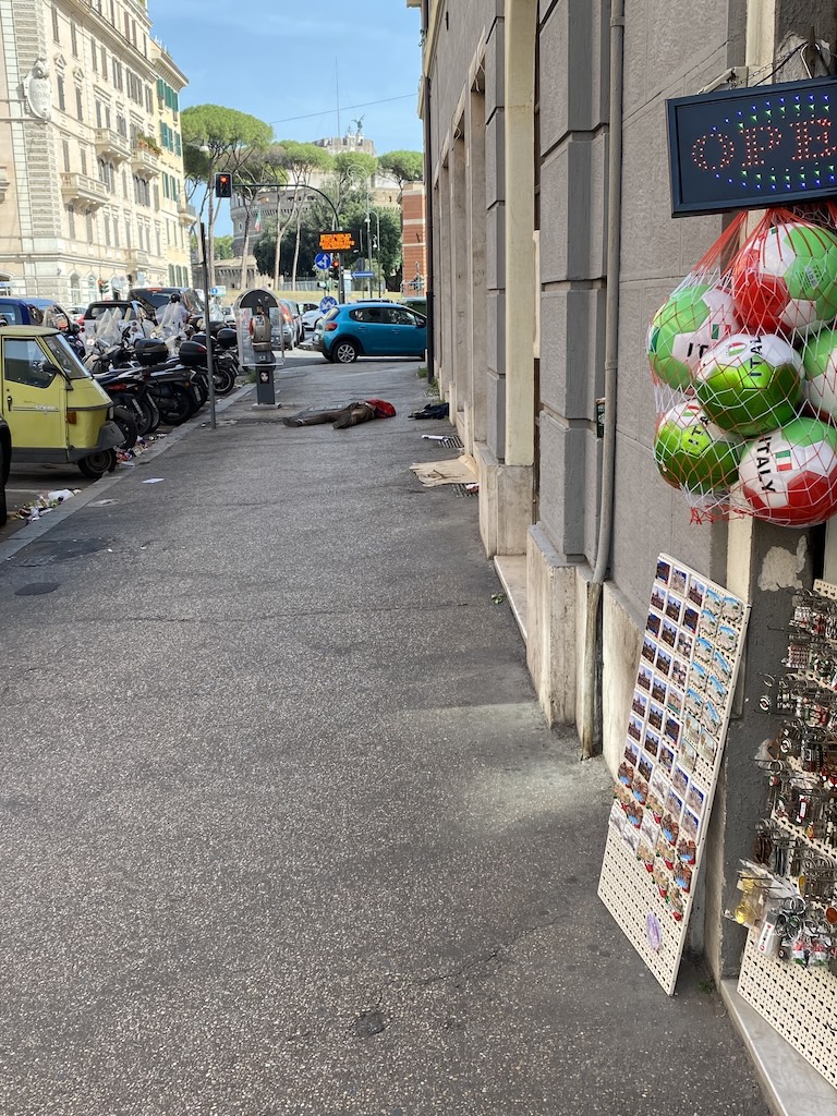 V pozadí tohoto malebného zátiší lze vidět Castel Sant' Angelo, směrem dozadu asi 250 metrů daleko je zeď Vatikánu, ulice mám dojem Via dei Corridori v samém centru Říma...