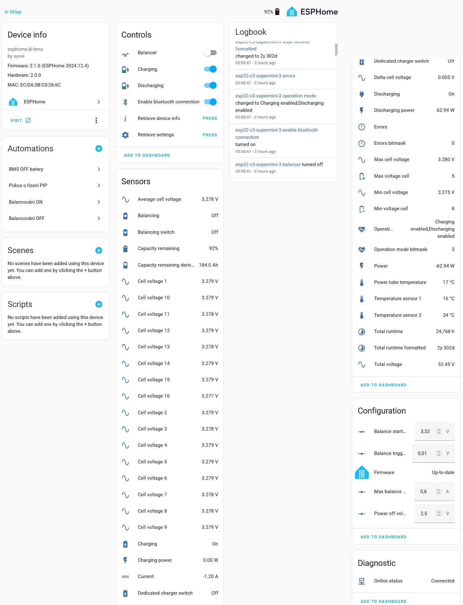 Zbastlíš to podle obrázku a k JK-BMS je to připojeno jen tím jedním kablíkem do slotu v JK-BMS. Z něj si to bere napájení pro DC/DC step down a i data. "ESP32 C3 mini" posílá přes wifi data do HA a přes BT nastavuje parametry JK-BMS. Pak můžeš mít mít k dispozici v HA třeba tyto informace a ovládací prvky: Obecný návod je na https://github.com/syssi/esphome-jk-bmsMigel píše: sob led 25, 2025 11:02 pmK tym especkam by som musel tak ci tak tahat kable na napajanie, akurat by bol mozno jeden adapter ale aj tak..pri dvoch, troch baterkach v pohode ale pri....