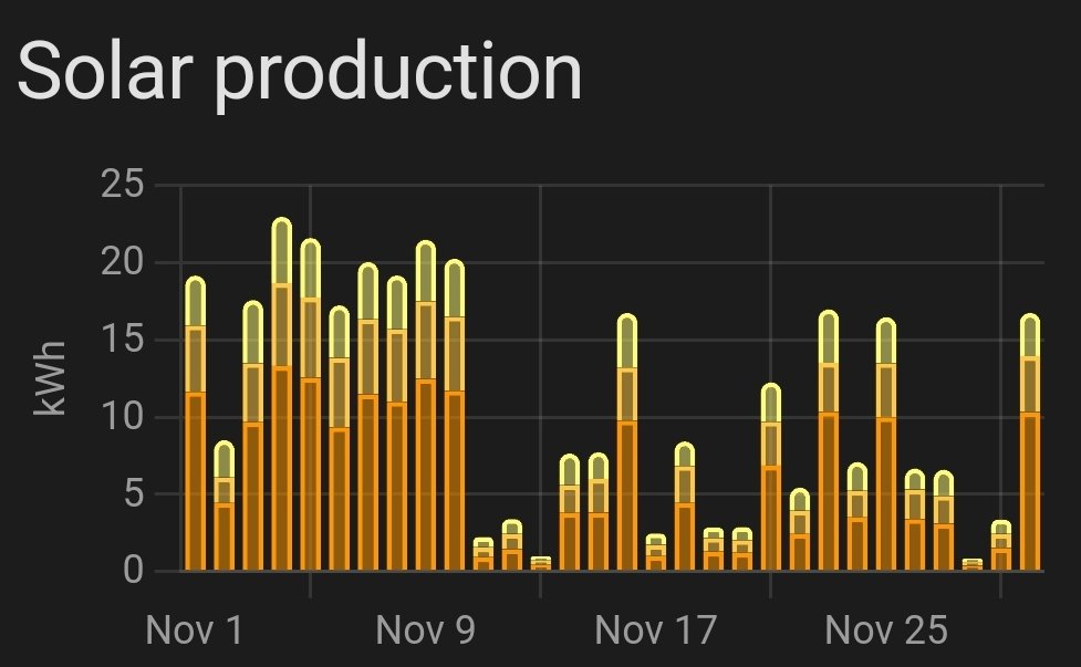 Tak keď tu už zopár ľudí rekapitulovalo, idem trochu aj ja. Za 2024 odobrané AC z FVE 4685 kWh (5431 kWh DC strana, 86% účinnosť celého systému), z DS 1061 kWh (z toho 471 kWh auto, takže 590 kWh do domácnosti). V máji som pridal meranie DC per string, 22.8. pribudol domov e-golf, 10.10. som pridal druhý menič a prerobil stringy východ+juh na východ+západ (z existujúcich panelov) a pridal nové panely na juh, čím som sa dostal skoro na 9 kWp.