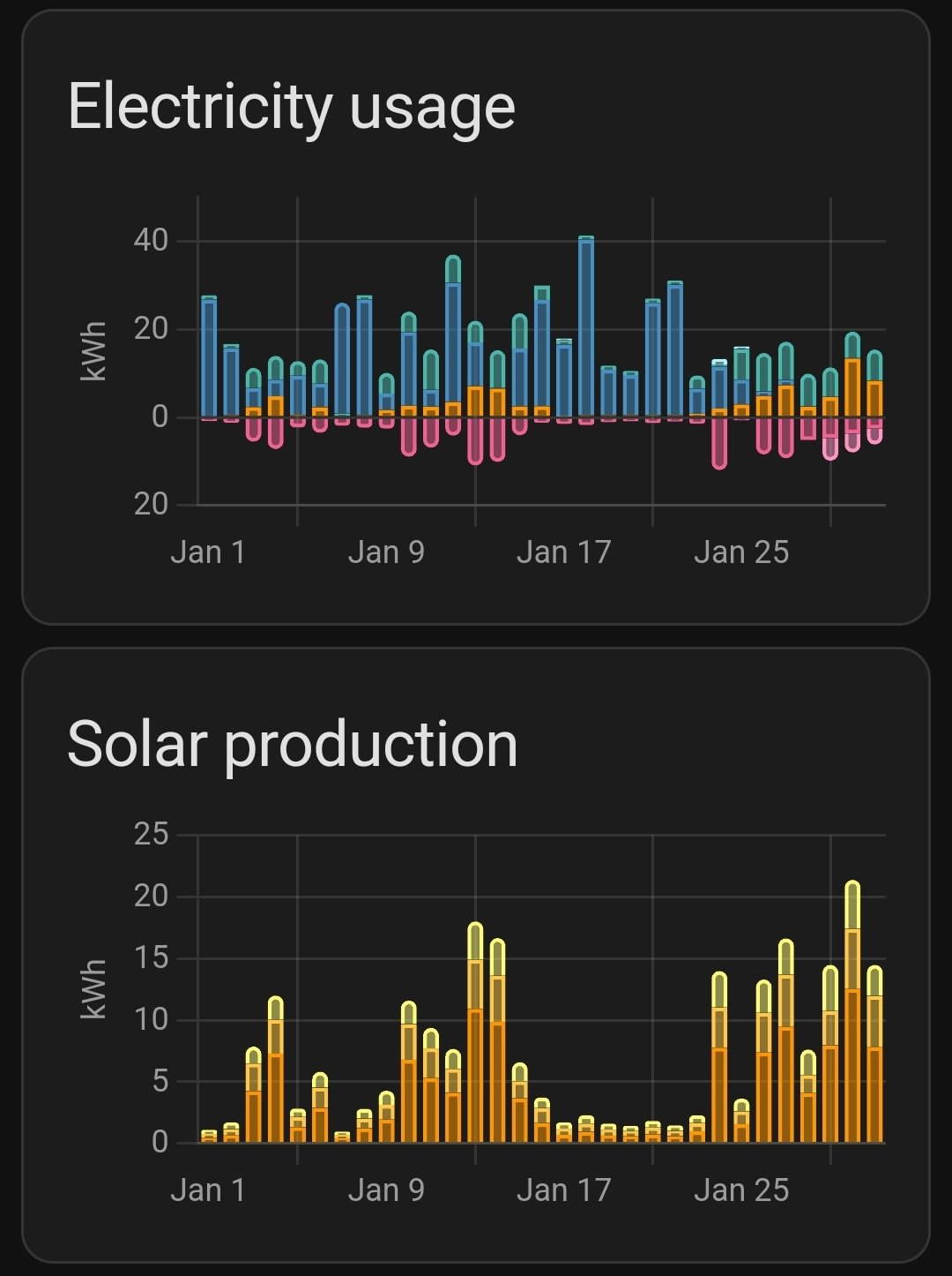 Za január prišlo 231 kWh na DC strane, aj to iba vďaka poslednému týždňu. Zo siete 384 kWh, kde veľkú časť zobralo auto. Bojler zatiaľ na rad neprešiel, ale dúfam že počas týždňa už pôjde niečo aj tam.