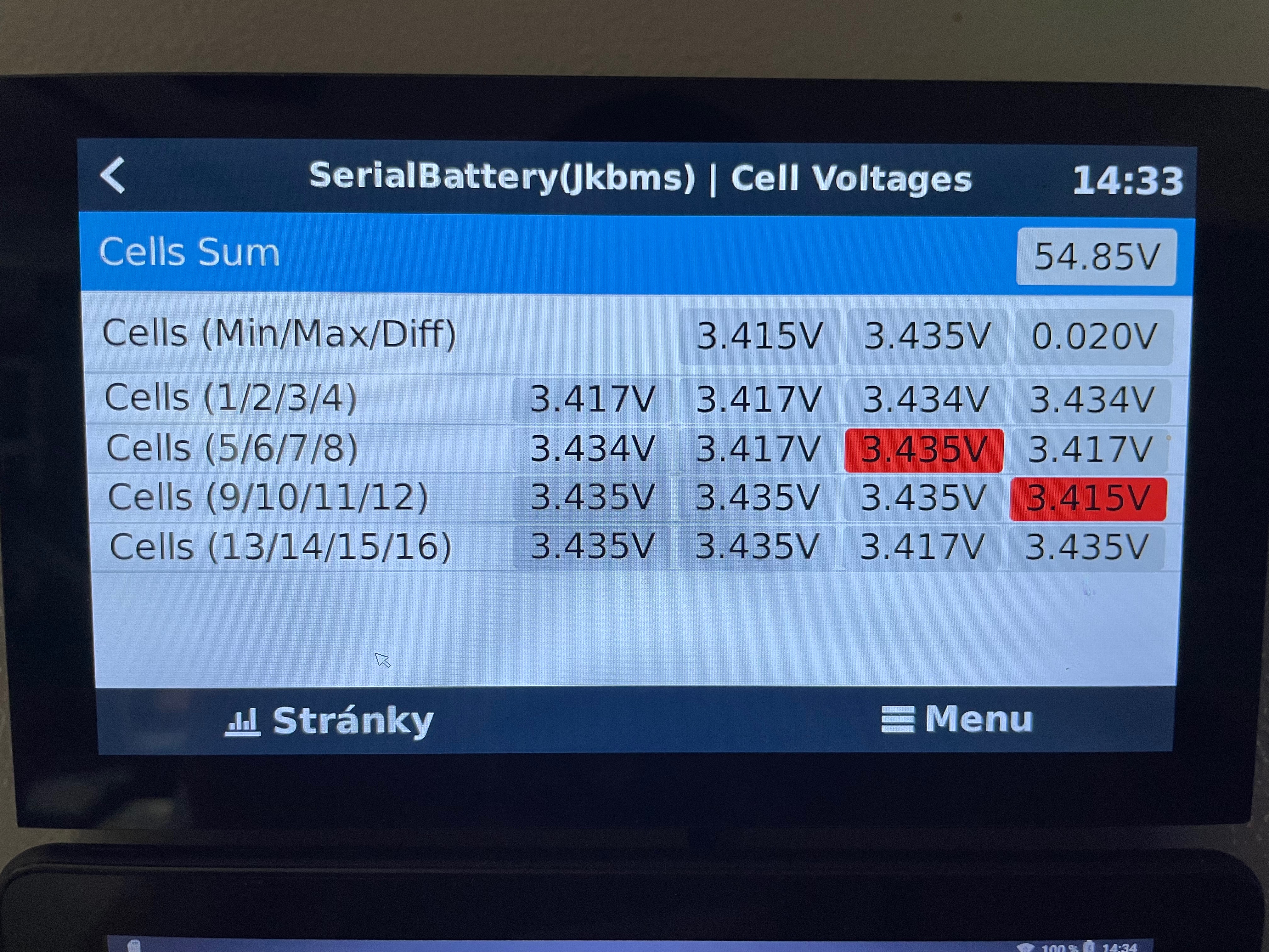 V souladu s doporučením ukončíš nabíjení při 14A- OK. Ale balancer nebo BMSka ty články srovnává podle napětí a klidně i 1A. Takže to jsou dva obtížně srovnatelné procesy. Balancer vlastně v rozporu s doporučením balancuje pod 14A. Já jsem instaloval paralelně k JK-BMS 4x NEEY 4A a balancování v JK-BMS jsem vypnul. Po pár týdnech jsem pokusně na jedné baterii WINSTON 120 Ah vypnul NEEY a naopak zapnul balancování v JK-BMS 1A. Mám to takhle už několik měsíců. Mezitím jsem dvakrát udělal ručně TOP srovnání na Absorbci 3,65V a zase zpátky. Tři baterie jsou trvale v toleranci 0,01V, ta čtvrtá na 30 minut 0,09V. A ta čtvrtá NENÍ ta, na které je NEEY vypnutá, je to EVE304. Můj závěr = Pokud je srovnáno, tak i JK-BMS s 1A na trvalý balancing stačí.ElektroEzs píše: pon srp 05, 2024 12:15 amTak jsem postupne clanky nabil a vzdy odpojil kdyz klesl proud pod 14A ale stejne je to nahore pri 54,8V rozhozeny o 180mv