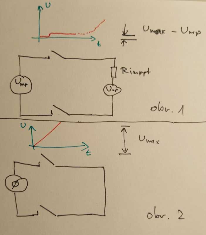 Při rozepnutí se na každém ze spínačů zvýší napětí o trochu, o polovinu rozdílu mezi napětím Umax a Umppt panelů.