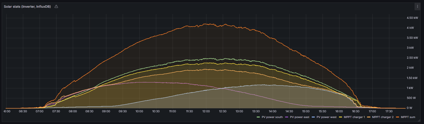Dnes krásny deň, 28.3 kWh z panelov. Pekne vidieť ako sa počas dňa mení výkon z východu a západu - paralelne spojené do jedného MPPT.