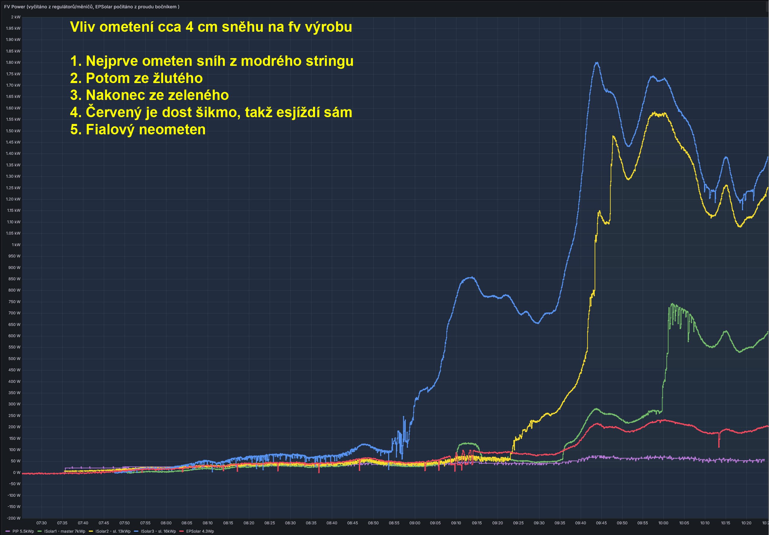 Ja ometám vždy, dnes 1cm ráno na paneloch, výkon 15w, hneď po očistení príjemných 300W z tmavej oblohy, každý wattík sa ráta. Teraz na obed je stále -0,5C a dáva 900W. Zajtra ráno zrejme zase bude rozcvička.