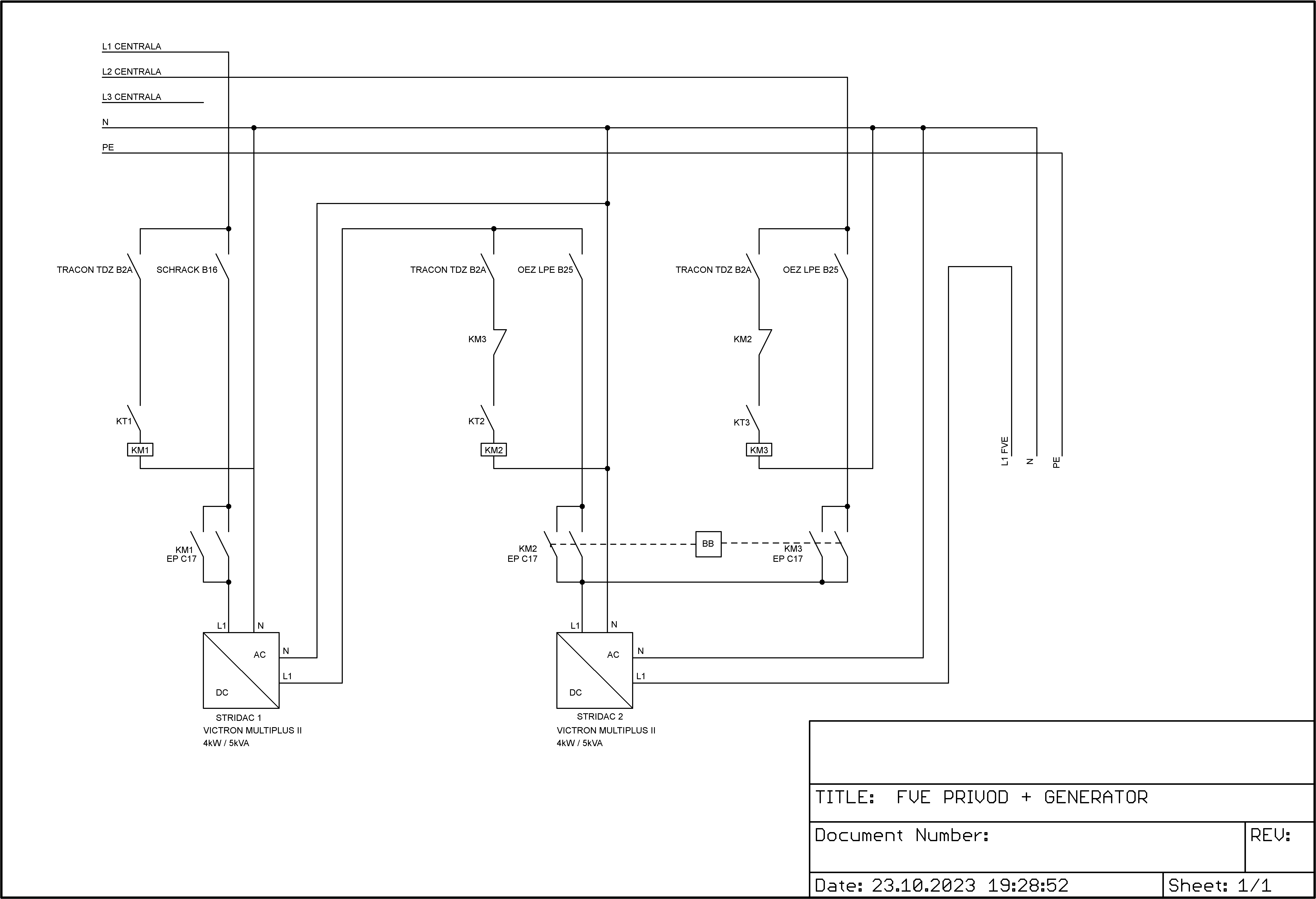 Předřazený střídač spínám asistentem ve střídači, relátkem v Cerbu (pro změnu opět generátor start/stop) zapínám síť - KM3 při poklesu SOC pod 30%, nebo poklesu DC napětí pod 49V.