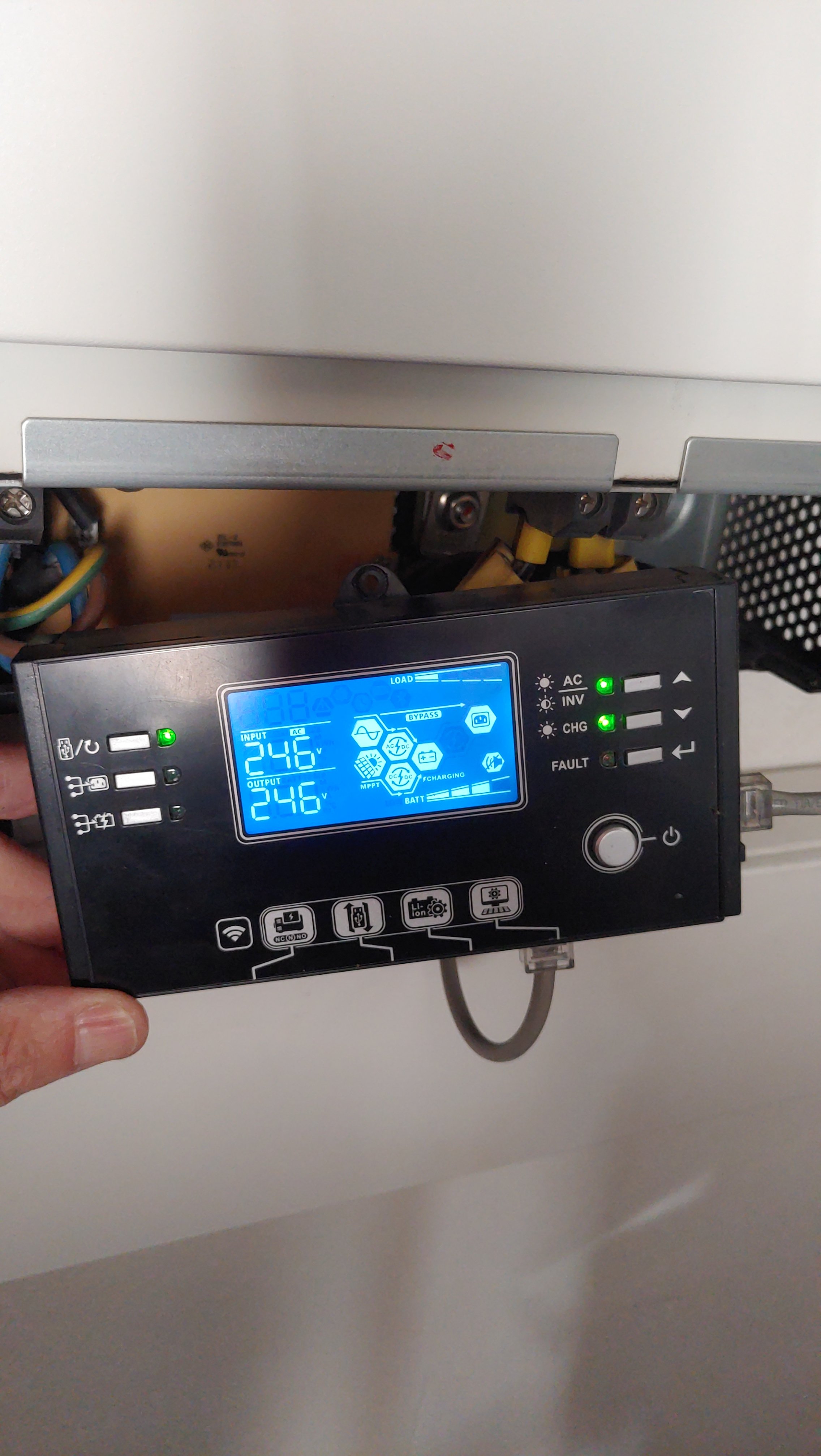 Začal jsem řešit servis, (zkusil jsem poslat email s popisem a fotky na gbc solino a dukom) S dukom komunikace OK ale gbc solino žádná realce. Proto když jsem dnes přišel z práce rozhodl jsem se měnič proměřit a popřípadě demontovat. Sundal jsem kryt lcd panelů odpojil lcd panel a najednou měnič změnil frekvenci větráku. Pri měření baterie, pv in i dc in vše vykazovalo normální napětí. Zapojil jsem tedy zpět displej a najednou dispjel najel do normálu, rozjeli se větráky a zacvakaly relé a měnič začal komunikovat jak přes wifi tak i přes kabel.