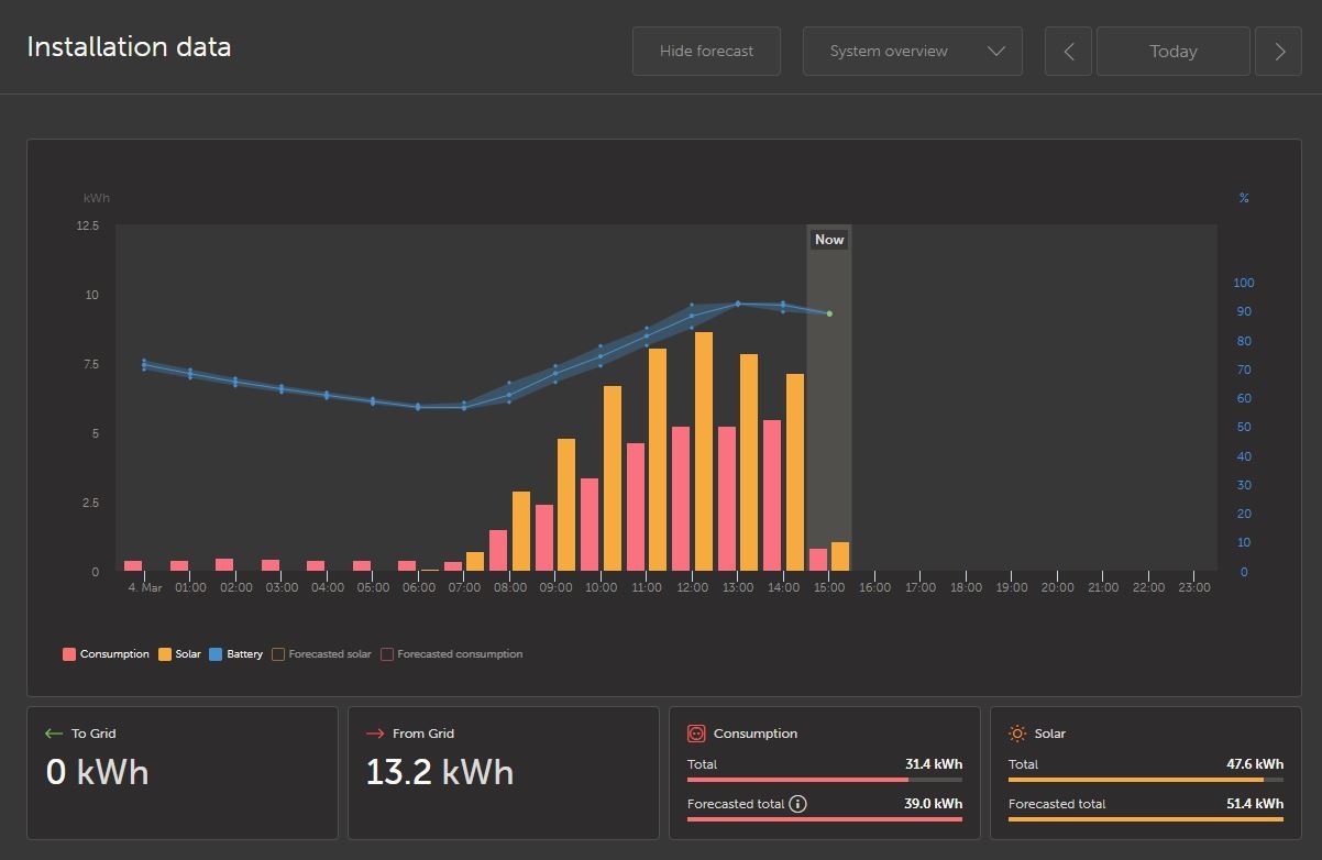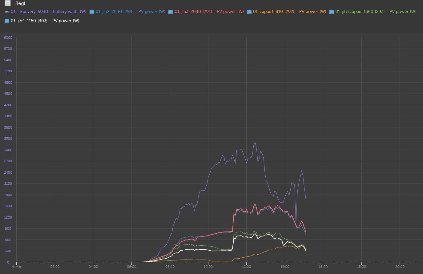Celkovou výrobu za ty 3 měsíce mam 95 kwh … občas to jelo hezky celý den, občas jen nějakou denní dobu. Překvapilo mě že to občas skáče třeba z 1 kw na 100w nebo obdobně v průběhu pár minut.