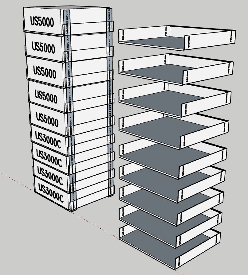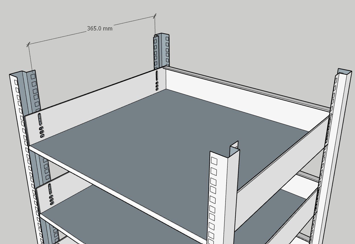 Zdravim pani, ti co mate cihly (pylony) v datovych rackoch, ako mate riesene police? Ak chcem narvat do racku co najviac tehal tak musim ist do custom riesenia cez L-profily (napr. klasicky ALU profil al. perforovany pozink...) alebo custom police kedze typizovane 1U police do racku nechavaju medzi jednotkami zbytocne velke medzery. Kedze som sa nevedel nikde dopatrat k vyhovujucemu systemovemu rieseniu a vzhľadom na finalnu vahu celej sustavy ~400kg som navrhol police pre štandardné rackové koľajnice pre datovu skrinu (600x600/800mm) ktore zvazujem dat do výroby. Su s variabilným fixovanim kde medzera medzi pylonmi ostava cca 10mm. Police budu z 3mm pozink plechu. Fixovane v 4 resp 8 bodoch, nosnost 50+kg. Su kompatibilne s US2000/3000/5000 AKU (Ale vzhľadom na nosnosť samozrejme aj pre ine AKU aplikacie). Takto vyzera "stack" pylonov 38,4kWh (4xUS3000+5xUS5000) pre 32U rack ktory mam v plane zostavit: